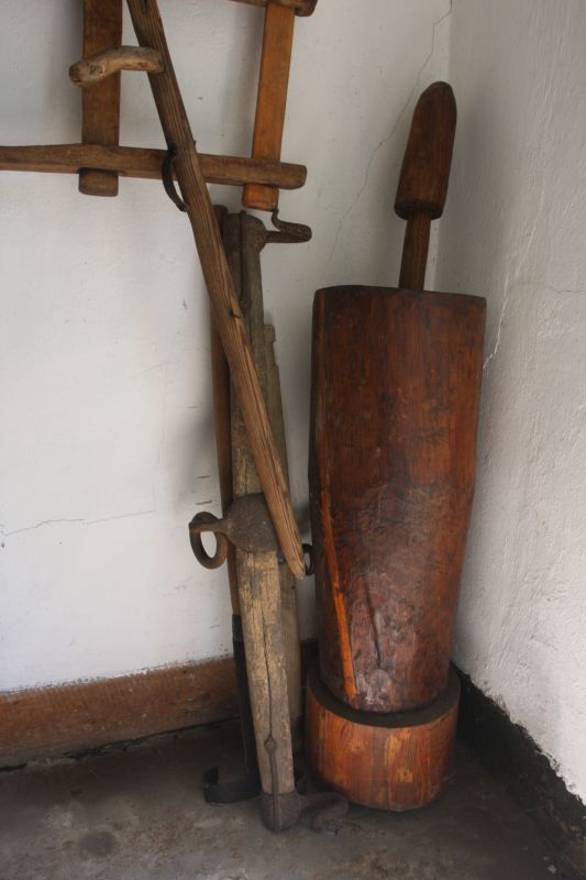 Sień w chałupie ze wsi Kopojno. W rogu – stępa, narzędzie do obłuskiwania i kruszenia ziarna na kaszę.
