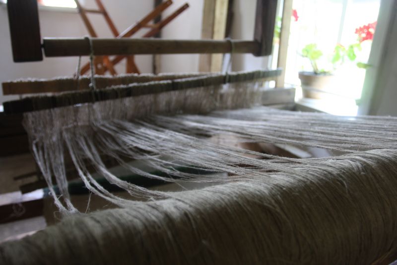 Wystawa o tkactwie w chałupie ze wsi Kopojno. Krosno. Widoczne podłużne nici osnowy.