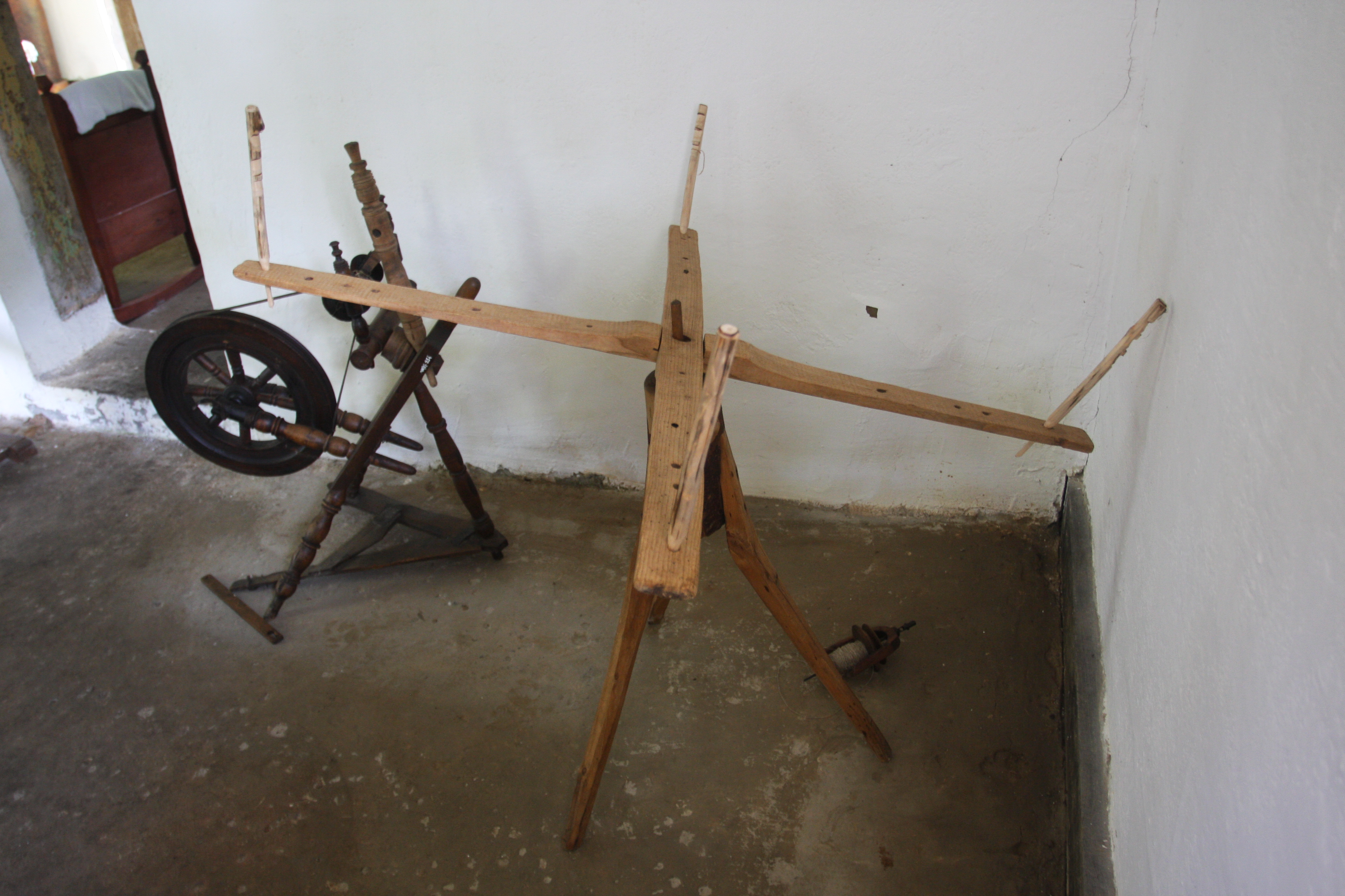 Wystawa o tkactwie w chałupie ze wsi Kopojno. Talka i kołowrotek.