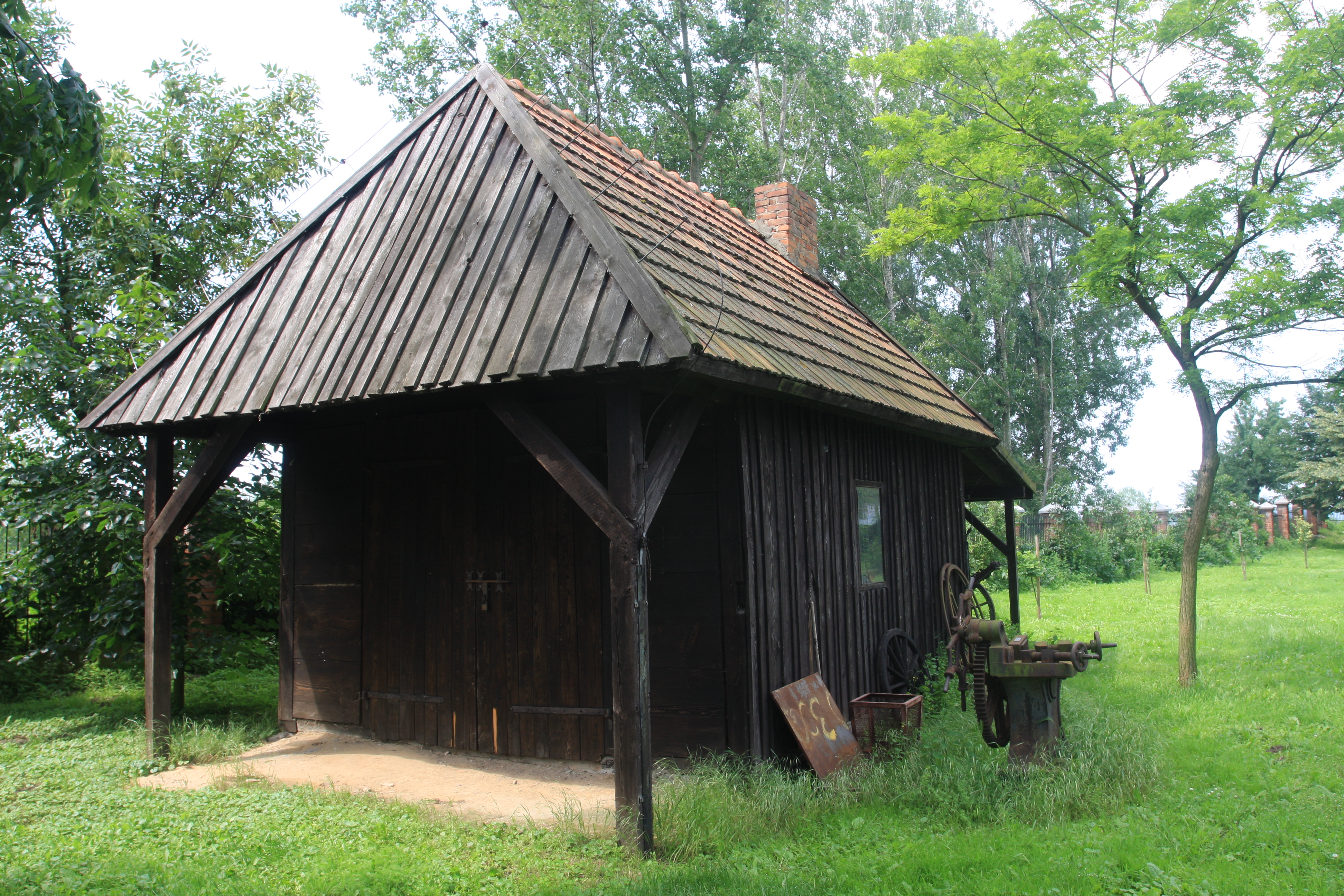 Replika kuźni ze wsi Tarnowa. Budynek o konstrukcji sumikowo-łątkowej z szalowaniem. Dach trójspadowy kryty gontem.
