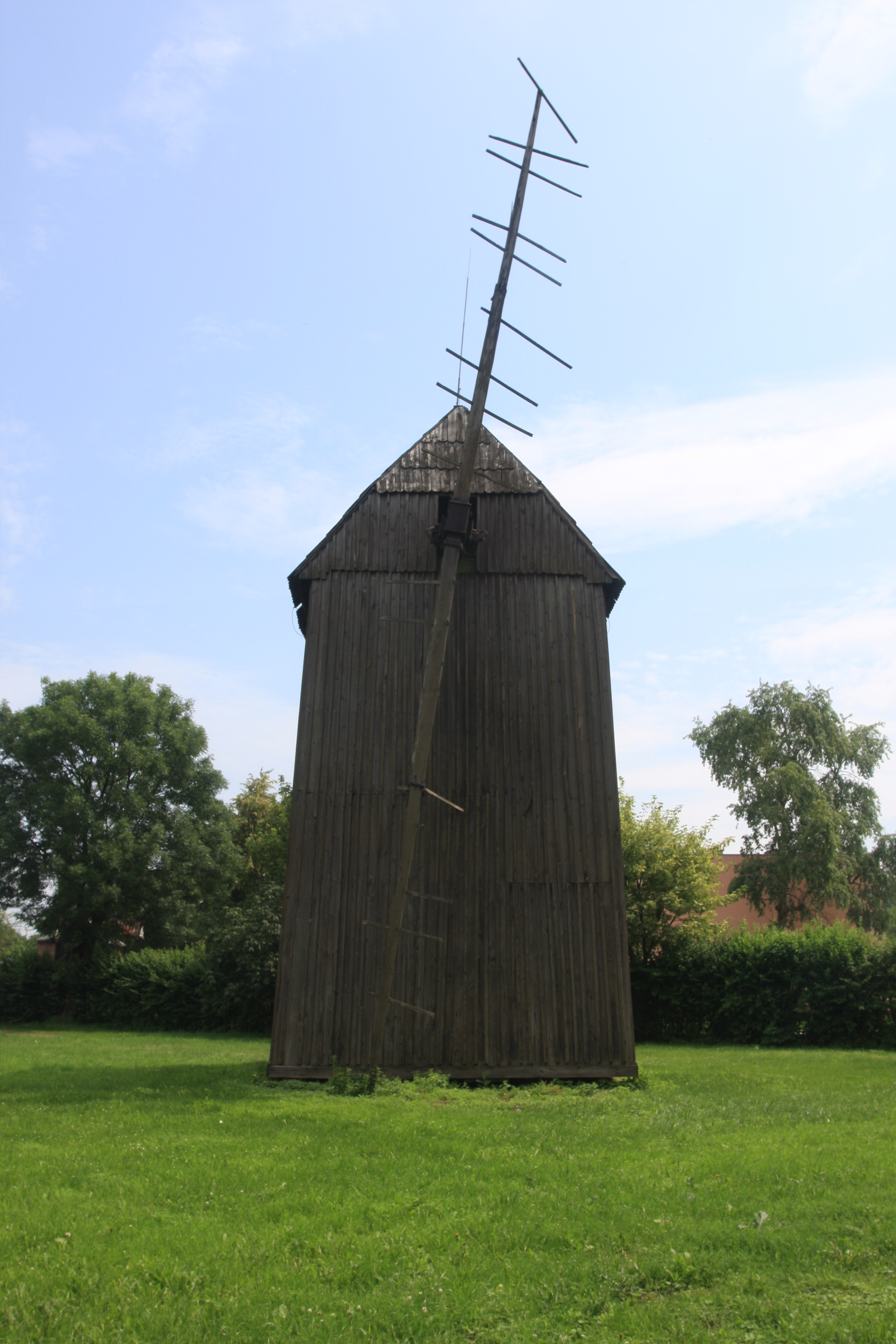Wiatrak “koźlak” zestawiony z elementów dwóch zniszczonych wiatraków z regionu (ze wsi Kotwasice, gmina Malanów i Goranin, gmina Ślesin). Wiatrak o konstrukcji słupowej, ryglowej, oszalowany deskami. Dach dwuspadowy z naczółkiem od strony skrzydeł.