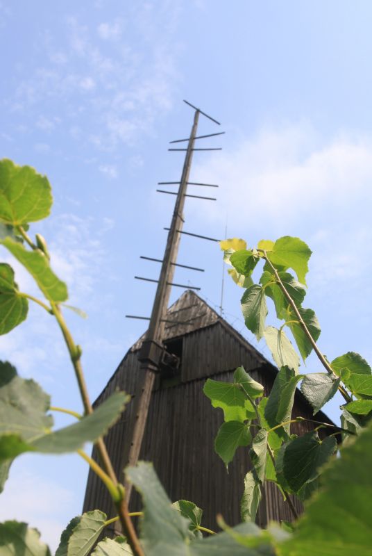 Wiatrak “koźlak” zestawiony z elementów dwóch zniszczonych wiatraków z regionu (ze wsi Kotwasice, gmina Malanów i Goranin, gmina Ślesin). Wiatrak o konstrukcji słupowej, ryglowej, oszalowany deskami. Dach dwuspadowy z naczółkiem od strony skrzydeł.