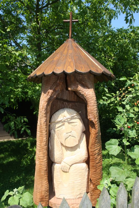 Drewniana kapliczka z figurą Chrystusa Frasobliwego przed chałupą ze wsi Kopojno.