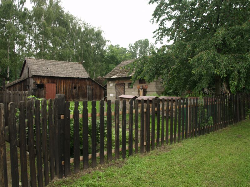 Zadroga znanego rzeźbiarza Szczepana Muchy, ze wsi Szale w gminie Klonowa z przełomu lat 50 i 60 tych XX wieku. Drewniany budynek, to obora, a murowany, to pracownia artysty.