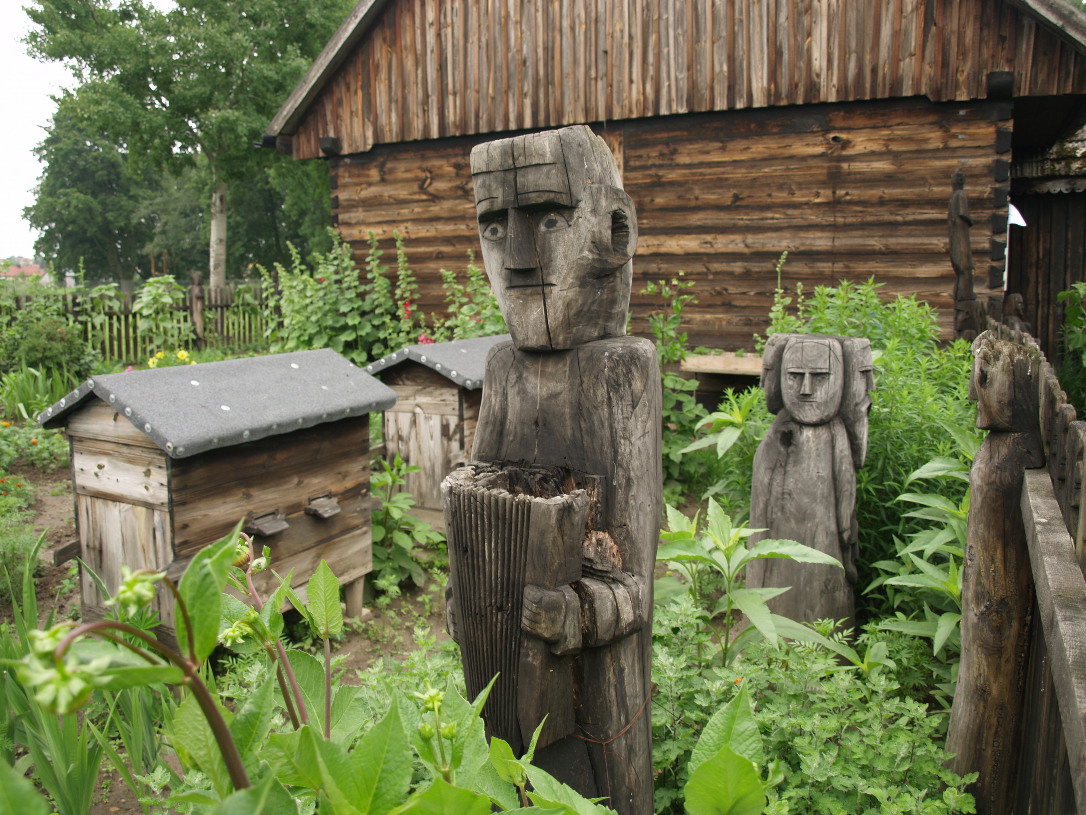 Ogród przed domem rzeźbiarza Szczepana Muchy: rzeźby drewniane z jednego kawałka drewna (na pierwszym planie akordeonista, na drugim Swarożyc) i ule skrzynkowe.