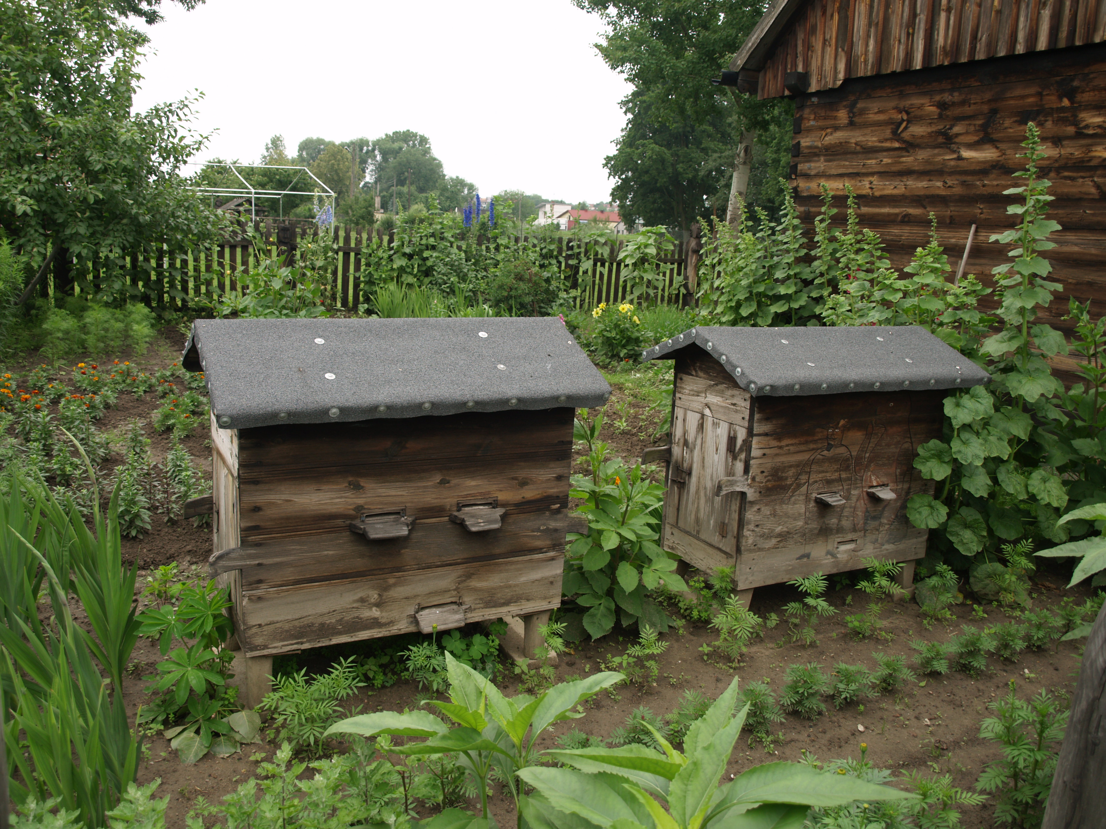 Ule skrzynkowe w ogrodzie przed rzeźbiarza domem Szczepana Muchy.