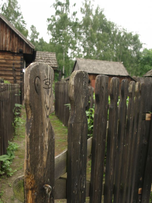 Rzeźbione sztachety płotu ogradzającego zagrodę rzeźbiarza Szczepana Muchy.
