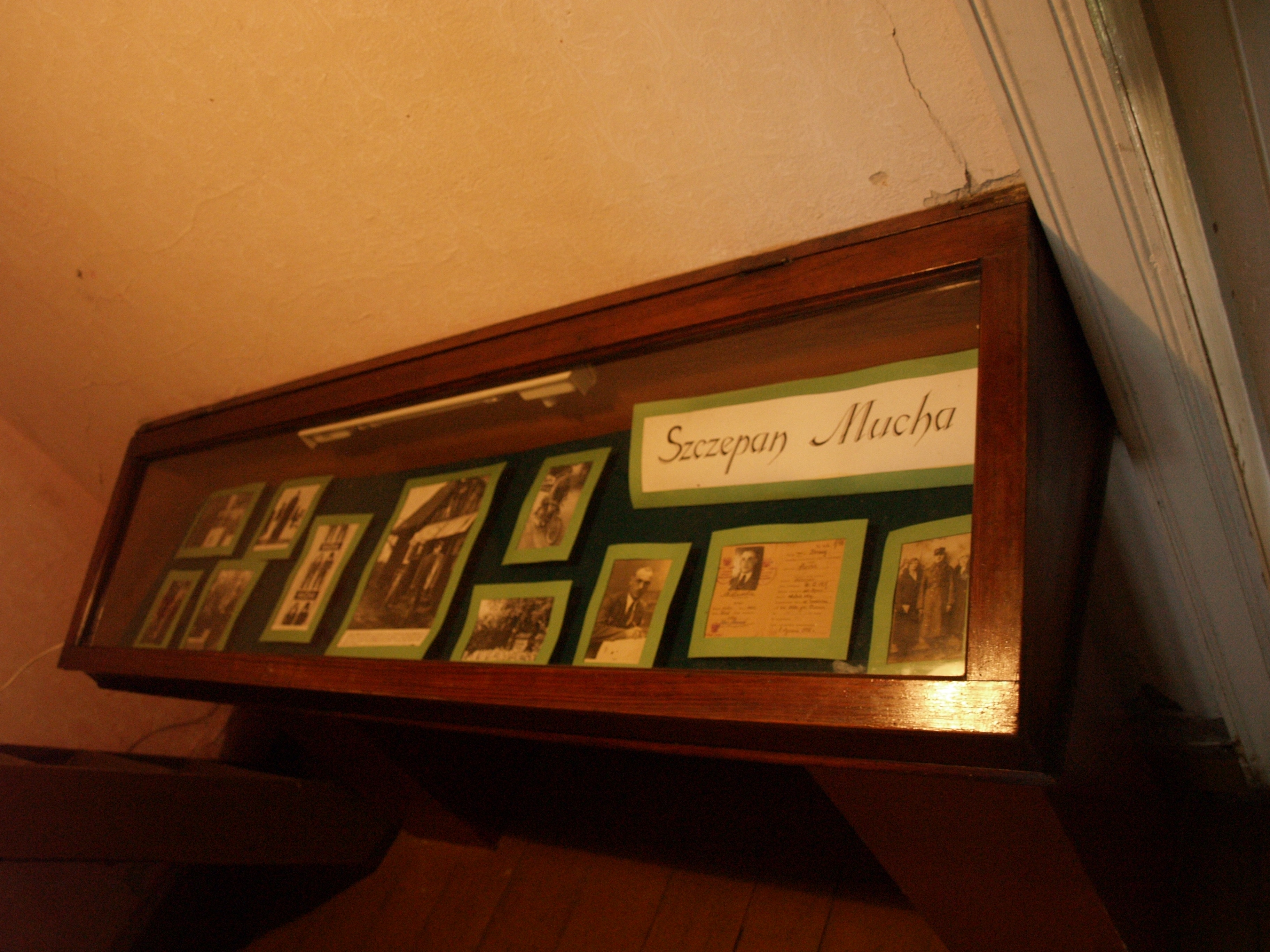 W korytarzu domu rzeźbiarza Szczepana Muchy gablota poświęcona jego pamięci.