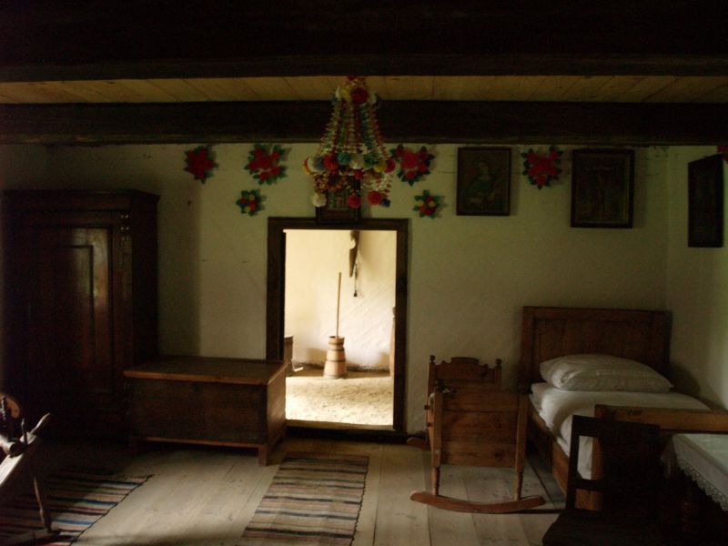 Wyposażenie izby mieszkalnej chałupy z miejscowości Sieradz z II połowy XIX wieku. Z sufitu zwisa świąteczny pająk z bibuły. Na ścianie święte obrazy i kwiaty z bibuły. Podłoga z desek.