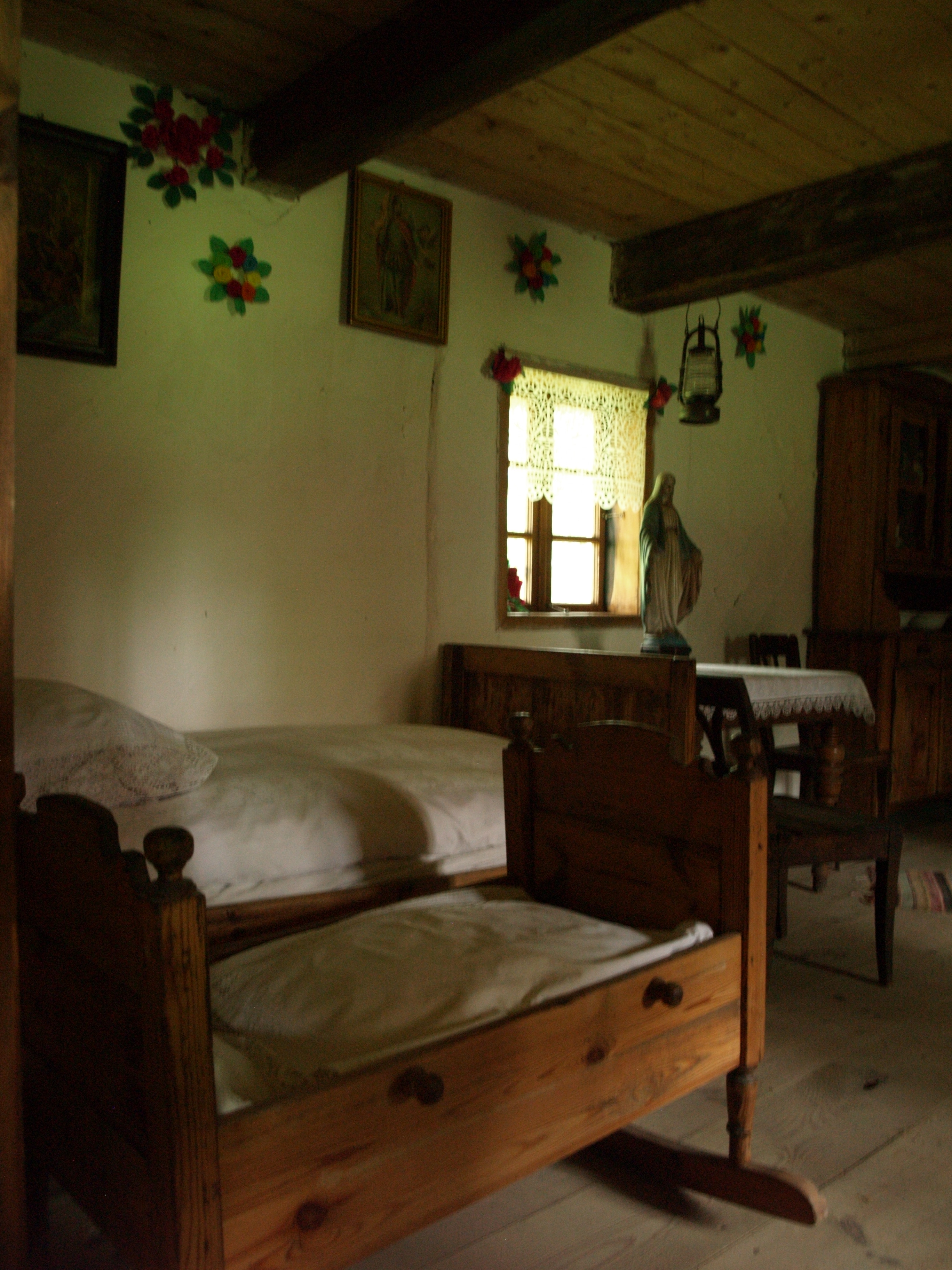 Łóżko i kołyska – fragment wyposażenia izby mieszkalnej chałupy z miejscowości Sieradz z II połowy XIX wieku. Ściana przystrojona kwiatami z bibuły. Podłoga z desek.