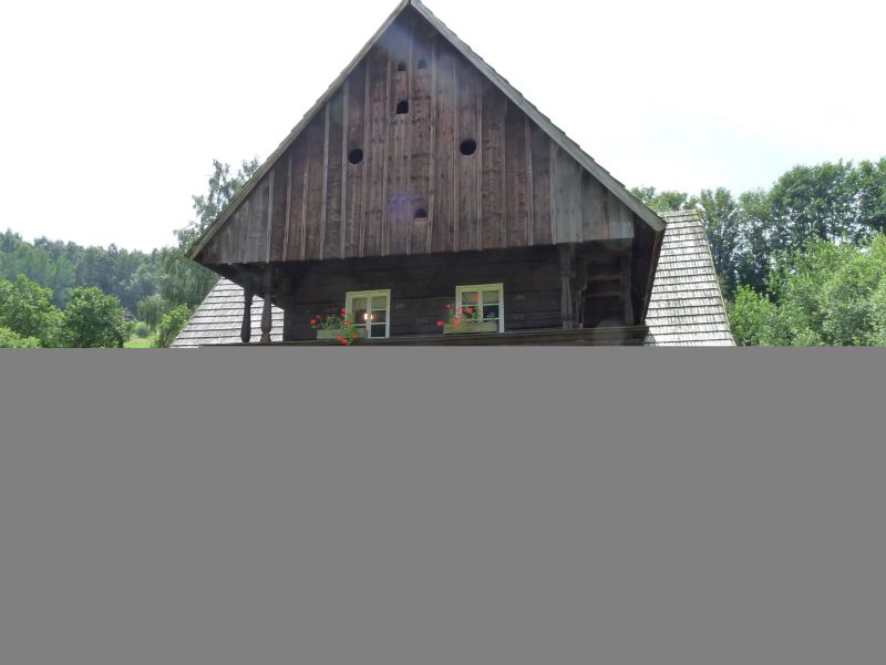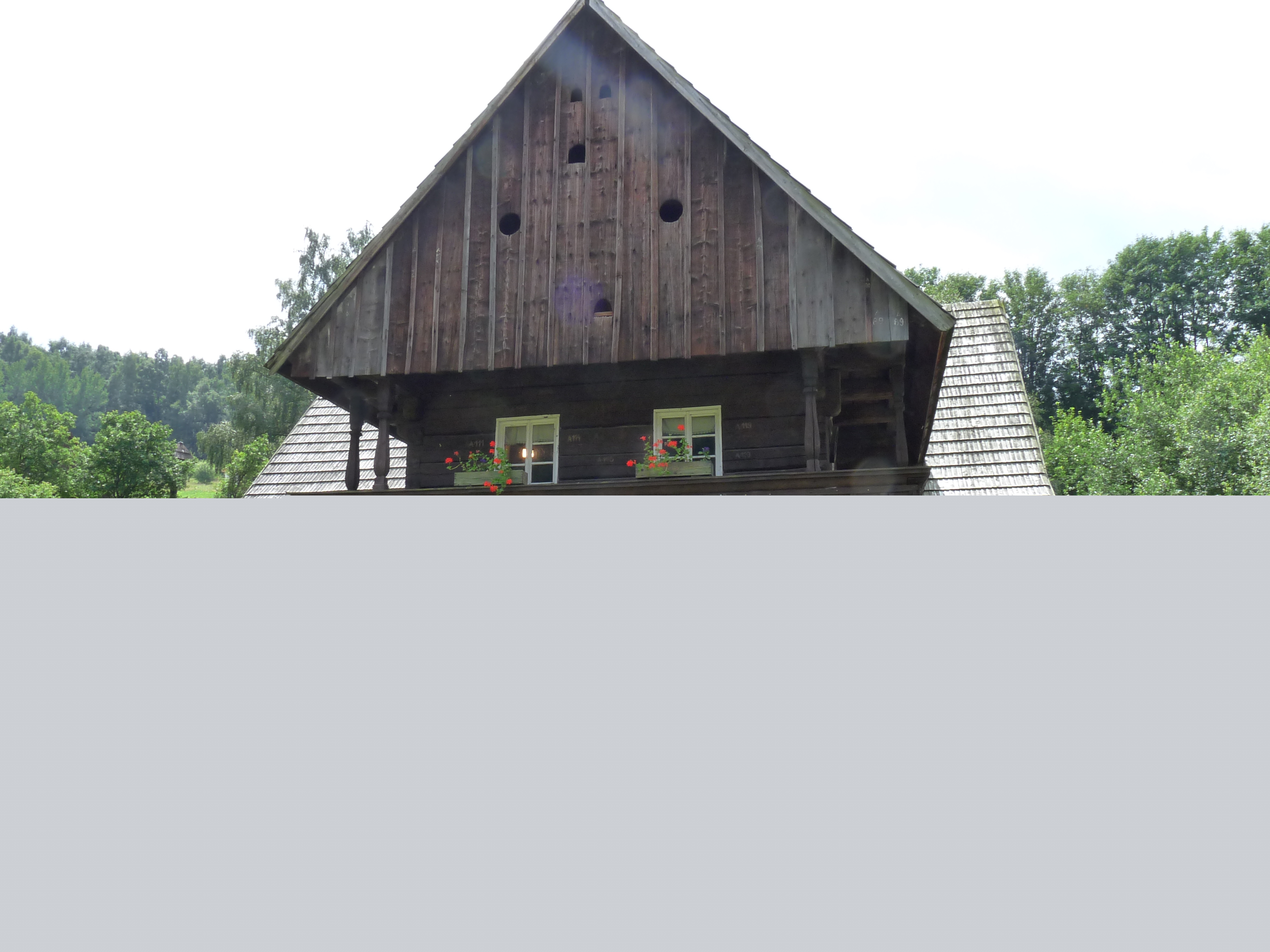 Zajazd - hałupa podcieniowa bielona, dach dwuspadowy kryty gontem, na zdjęciu widoczne wysunięte podcienie z mieszkaniem na górze.