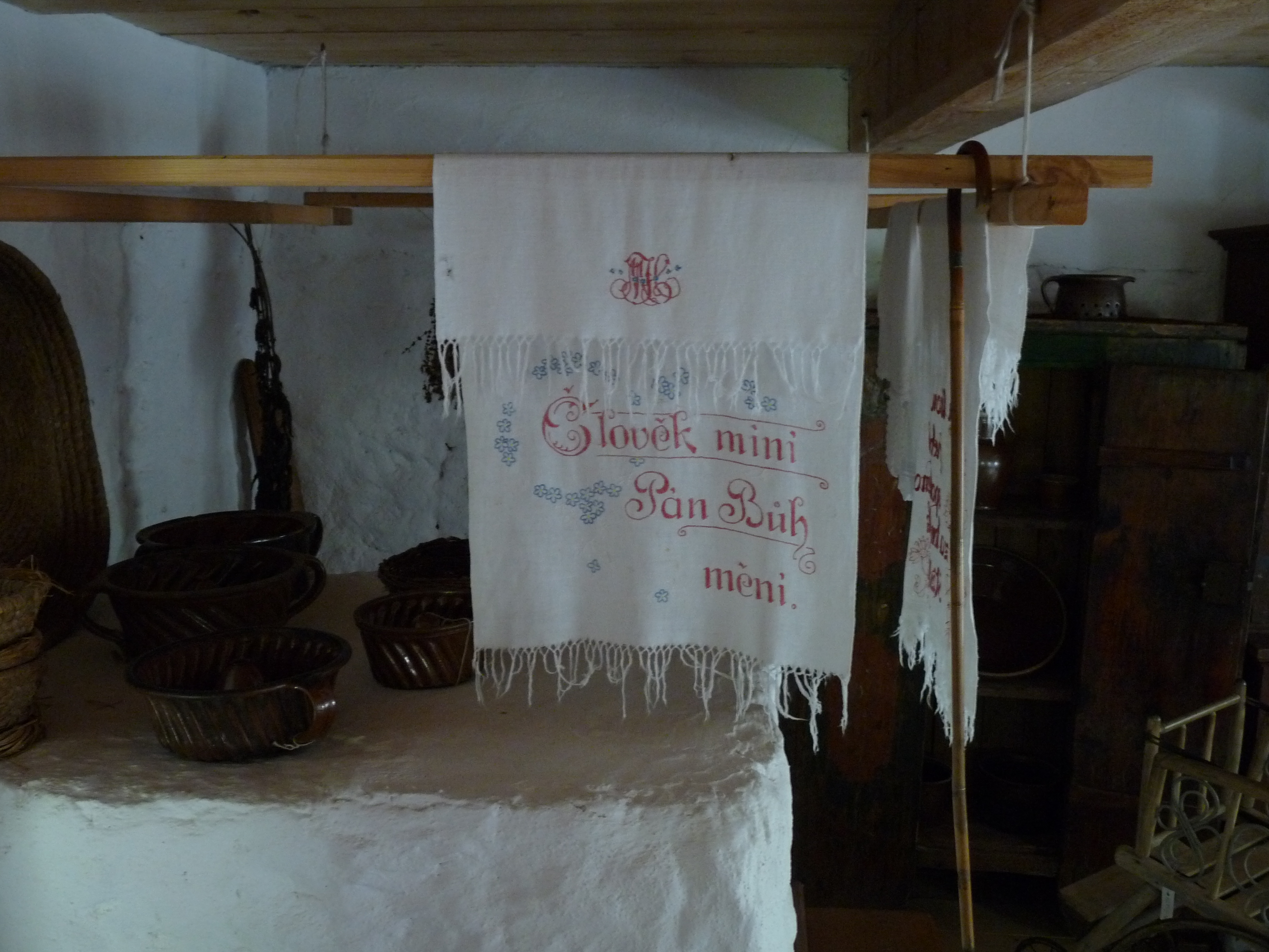 Wnętrze chałupy ze wsi Kudowa Zakrze z przełomu XVIII i XIX wieku. Widoczny piec i suszące się na zawieszonej pod sufitem konstrukcji z belek wyszywane makatki z czeskim napisem „Clovek mini, Pan Buh meni”. Na piecu ceramiczne naczynia.
