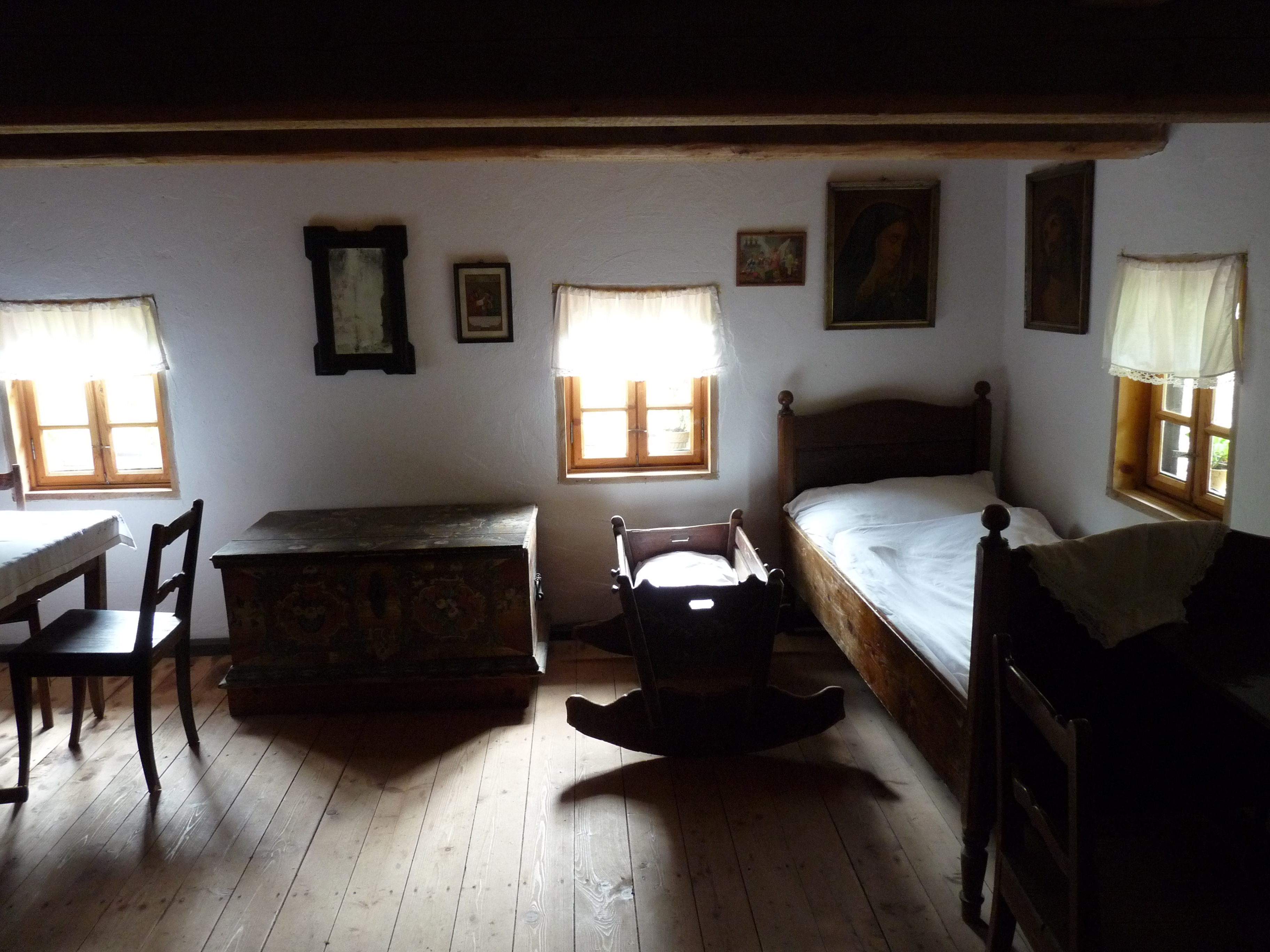 Wnętrze chałupy ze wsi Kudowa Zakrze z przełomu XVIII i XIX wieku. Widoczny łózko, kołyska na biegunach i malowana skrzynia wienna.