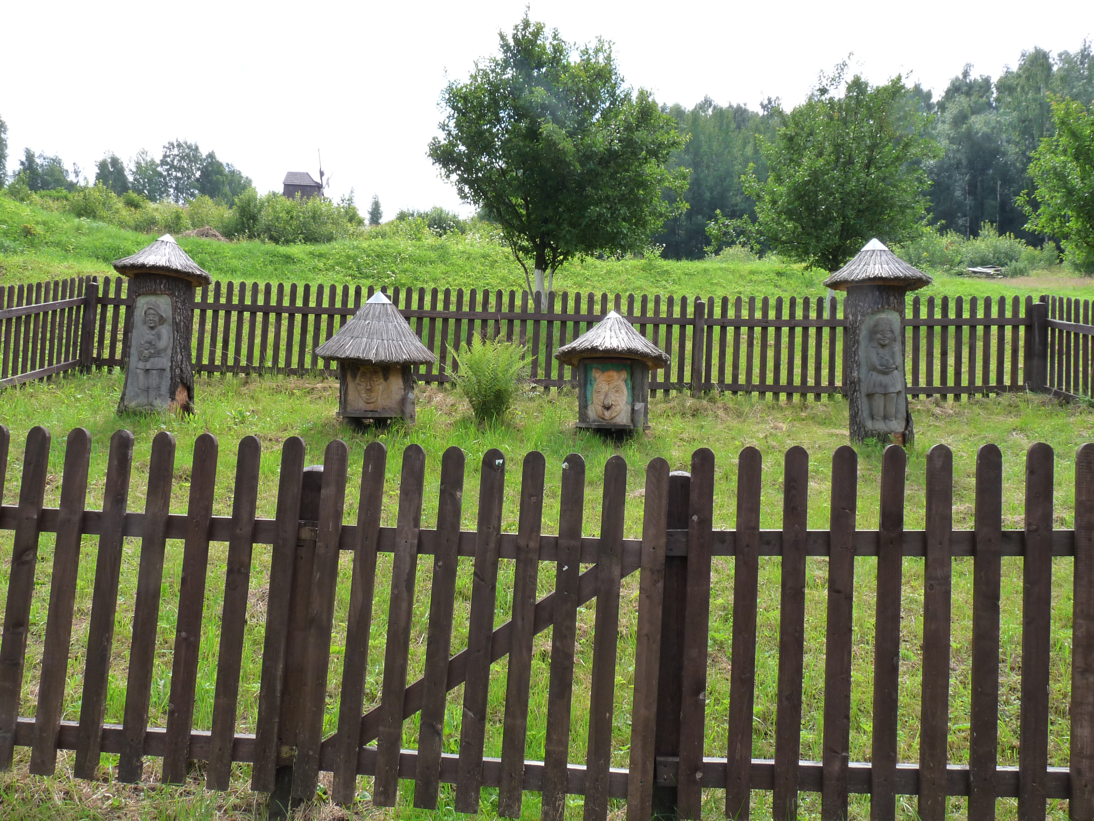 Pasieka ogrodzona drewnianym płotem sztachetowym. Cztery ozdobne ule kłodowe z płaskorzeźbą wykonane przez Ryszarda Sułkowskiego z miejscowości Bolków. Daszki stożkowe kryte słomianą strzechą.