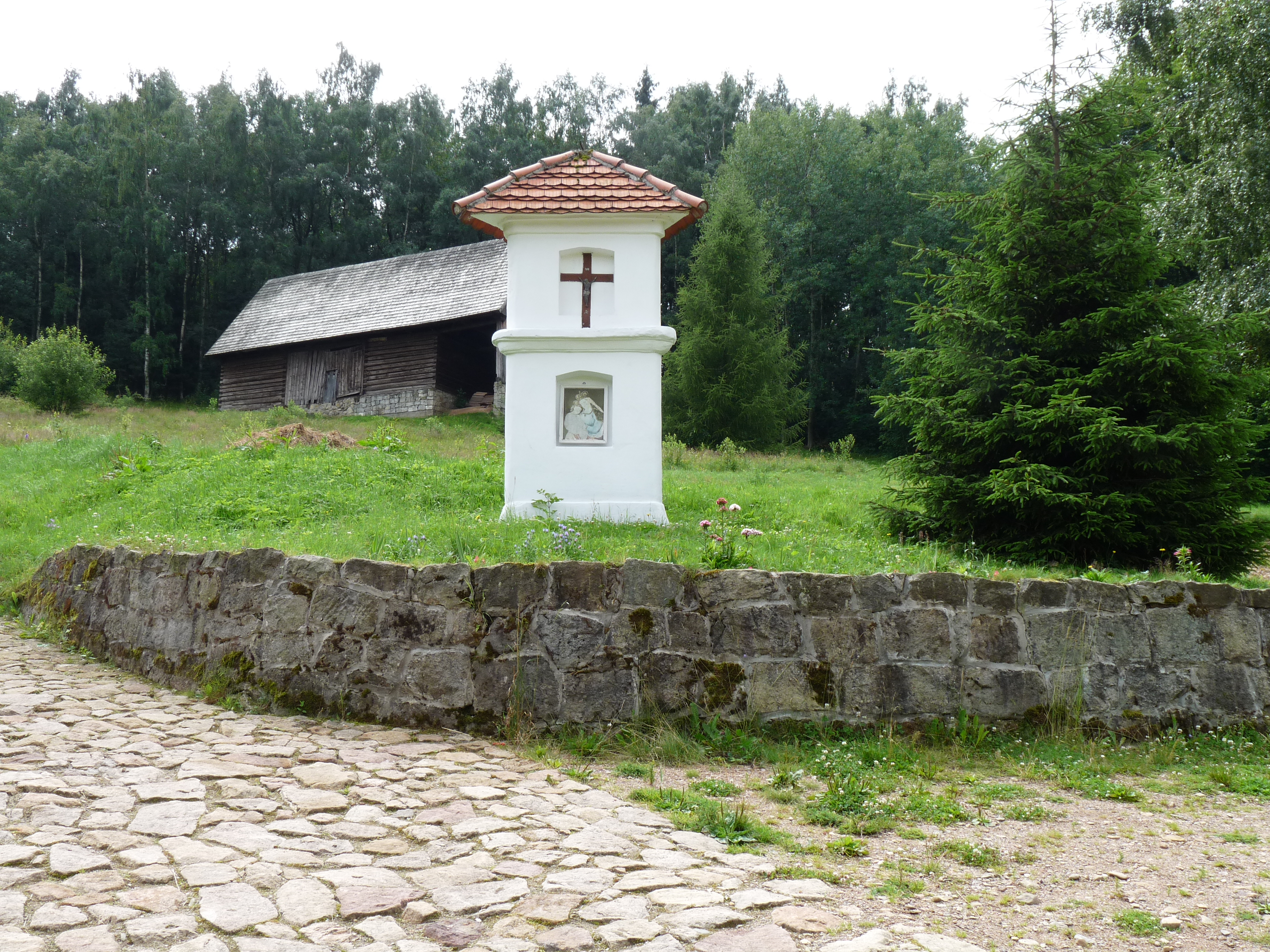 Murowana kapliczka. Dach czterospadowy kryty dachówką.