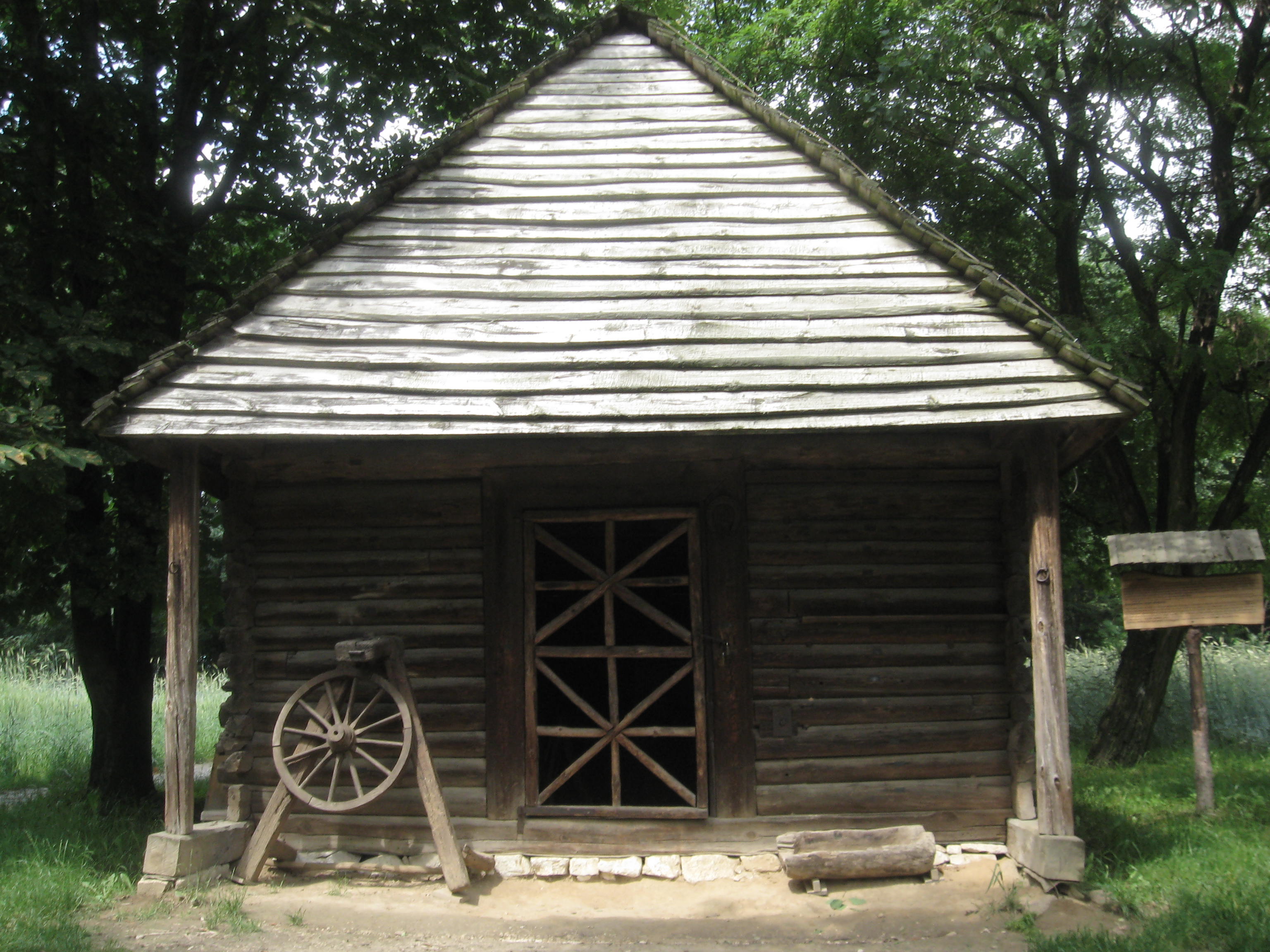 Kuźnia ze wsi Urzędów z 1915 roku. Budynek o konstrukcji zrębowej (węgłowej) z podcieniem szczytowym. W podcieniu podkuwano konie, natomiast w „kurnym” wnętrzu prócz podków czy sprzętu rolniczego właściciel wykonywał też prace „artystyczne”. Brak komina – czyli wspomniany już system „kurny”, w którym dym ucieka poprzez okna i szpary w deskach, był pierwotnym i popularnym urządzeniem tego typu budynków w regionie. |