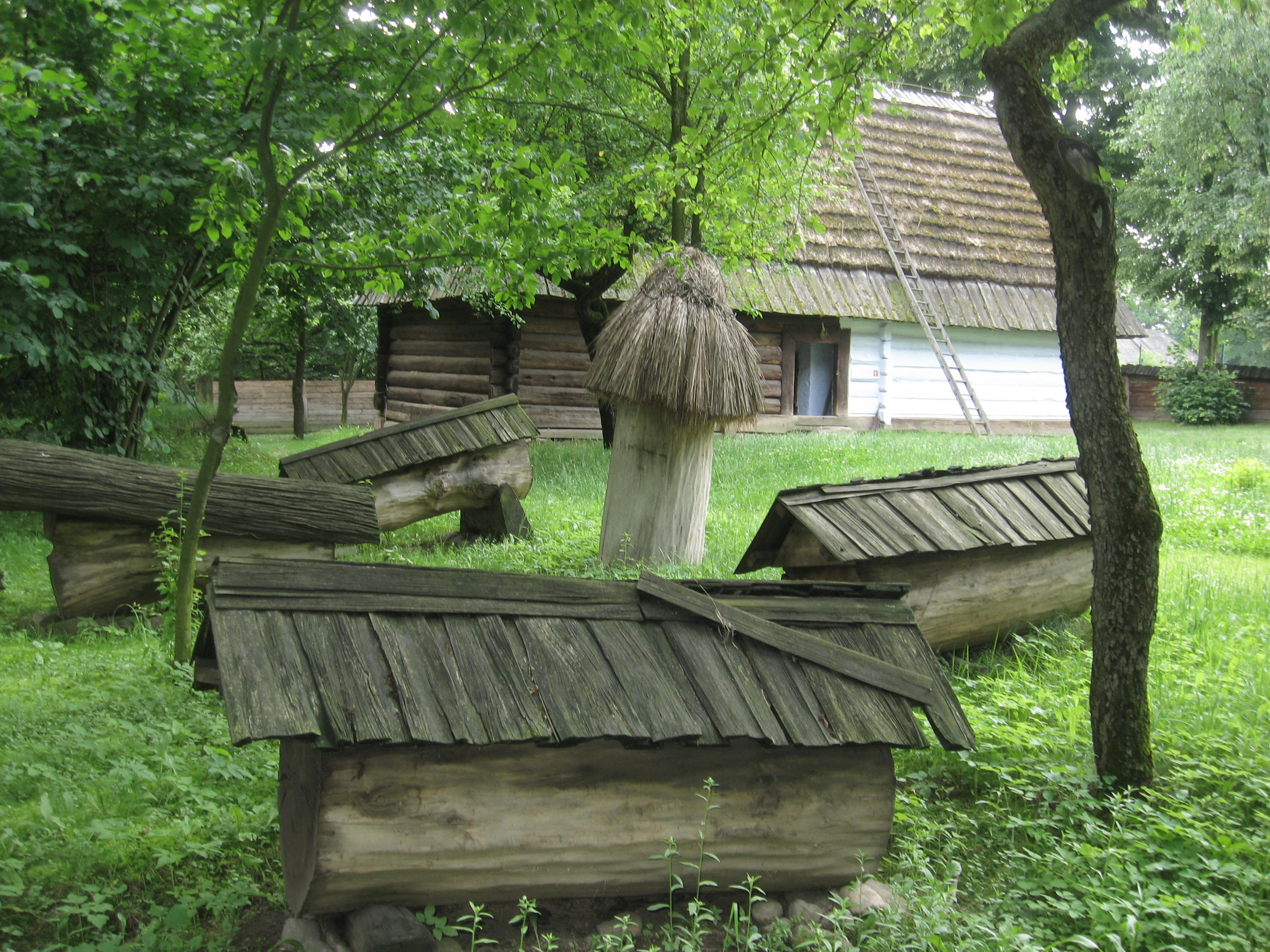 Przydomowa pasieka w zagrodzie ze wsi Korytków Duży. Ule kłodowe leżące i stojące.