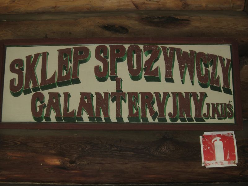 Szyld sklepu na chałupie z Roztocza. W latach dwudziestych XX wieku chałupa z Roztocza mieściła lokalny sklepik, co starano się odtworzyć w skansenie.