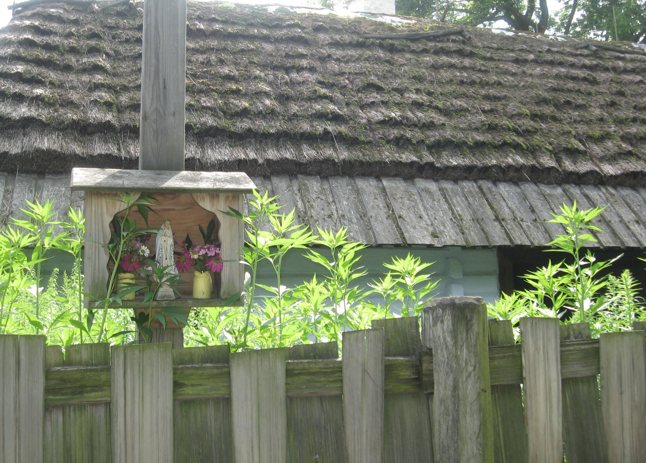 Niewielka kapliczka umiejscowiona w dolnej części krzyża przydrożnego prezentująca najpopularniejsze postacie świętych. Na zdjęciu figurka Matki Boskiej.