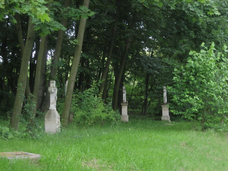 Przycerkiewne lapidarium prezentuje kamienne figury nagrobne wykonane w początku XX wieku przez ludowego kamieniarza.