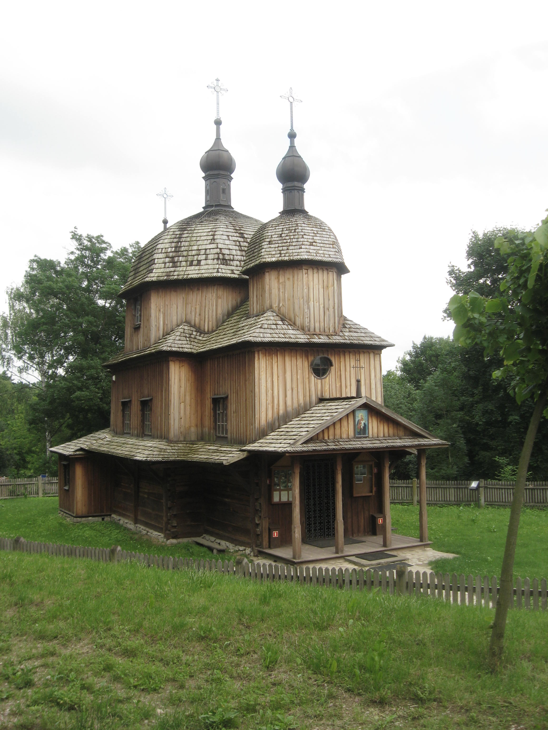 Cerkiew z miasteczka Uhrynów z 1759 roku. Cerkiew drewniana o konstrukcji zrębowej (węgłowej) pokryta szalunkiem. Bryła trójczłonowa z trzema kopułami krytymi w rekonstrukcji gontem, pierwotnie blachą ocynkowaną. Zewnętrzny trójpodział odwzorowany we wnętrzu.