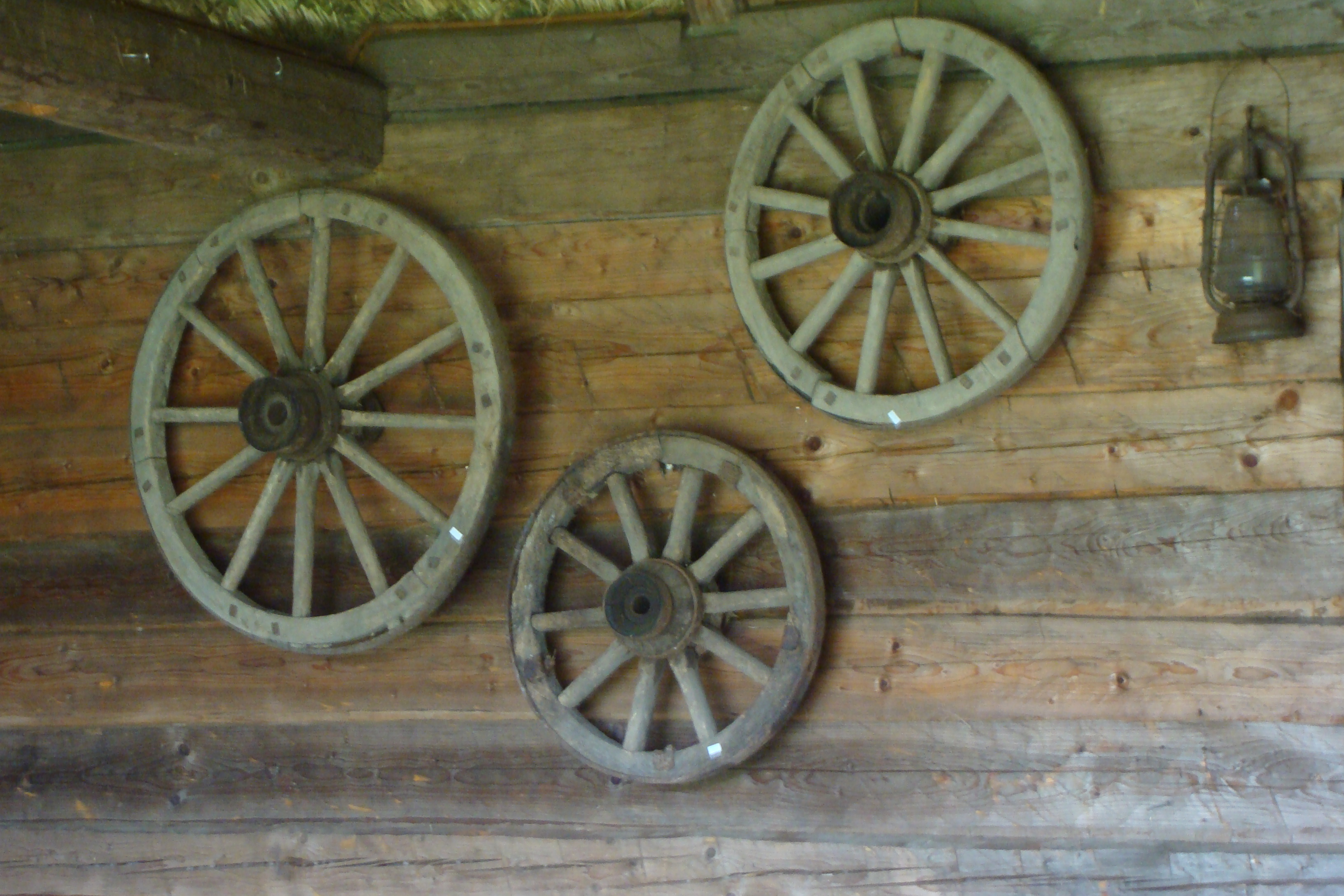 Zaaranżowane wnętrze stodoły. Na ścianie wiszą drewniane koła od wozów.
