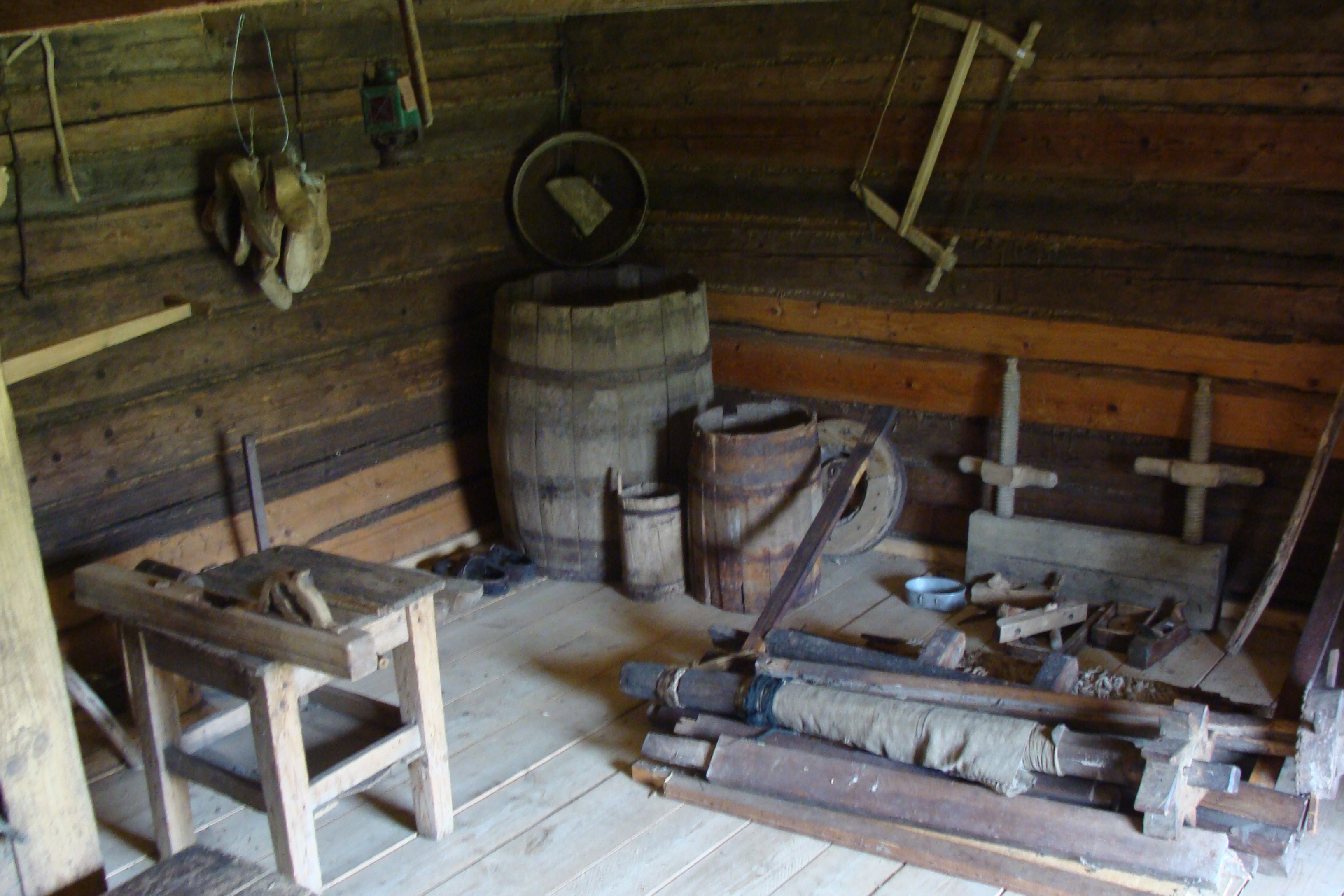 Wyposażenie spichlerza. Po prawej an ziemi części składowe warsztatu tkackiego. Po lewej, na drewnianym stołku hebel, prócz tego beczki drewniane, sito, drewniane prawidła do butów, lampa oliwna i piła.