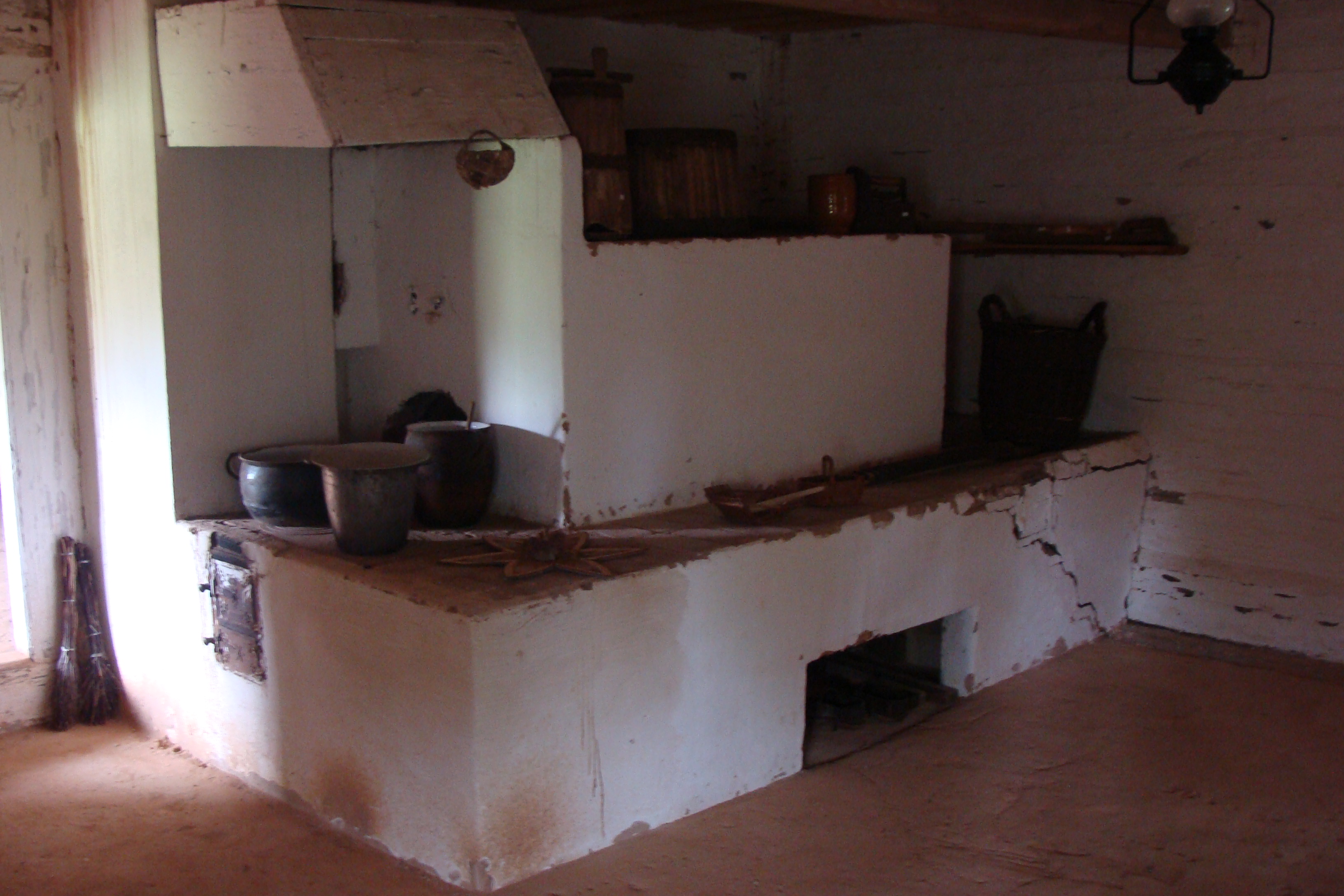 Urządzenie ogniowe z paleniskiem zamkniętym (typu angielskiego) w chałupie litewskiej. Nad kuchnią kaptur. Podłoga z gliny.