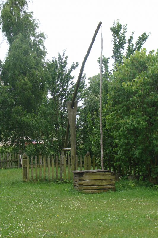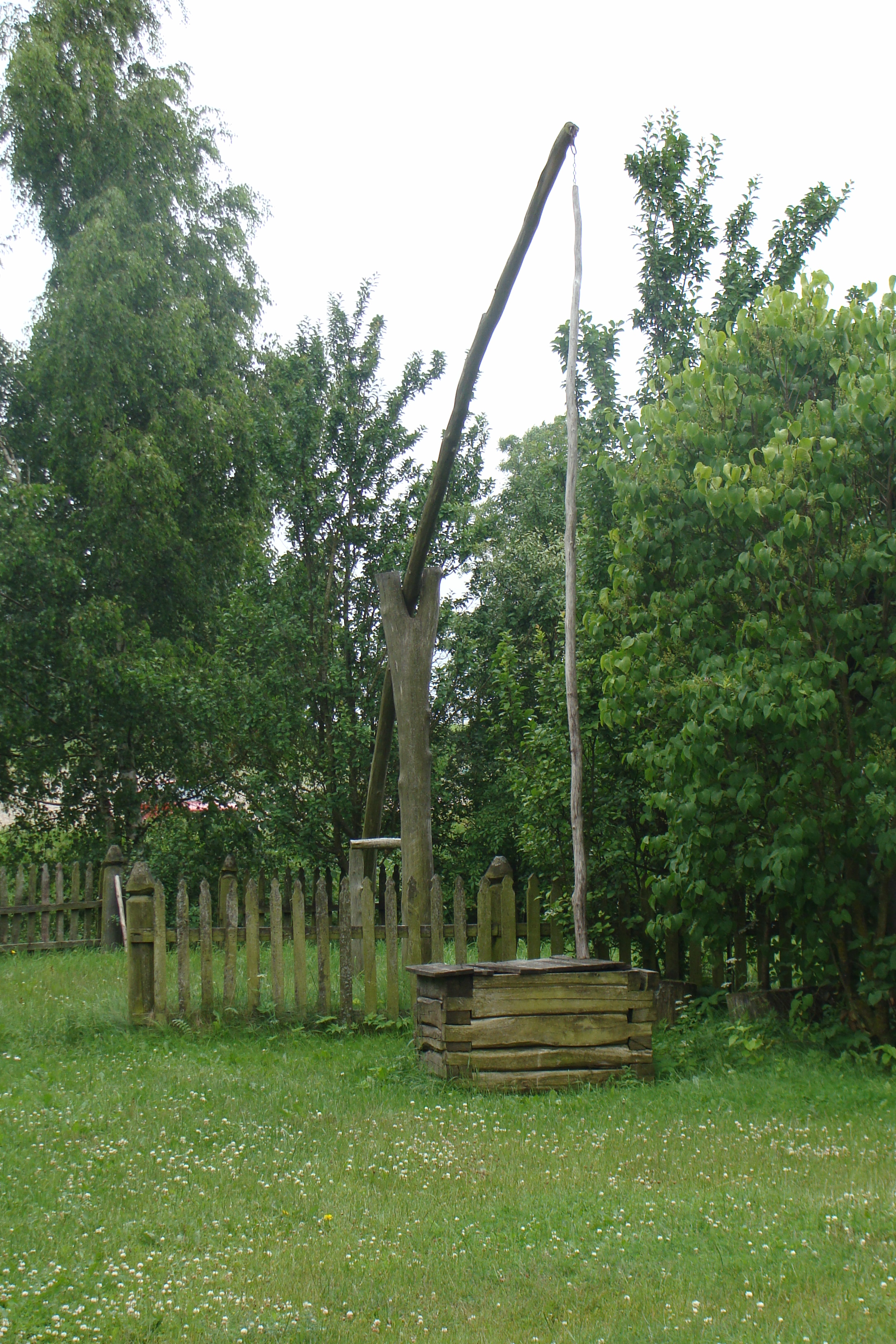 Studnia z żurawiem. Studnia z cembrowiną o konstrukcji zrębowej.