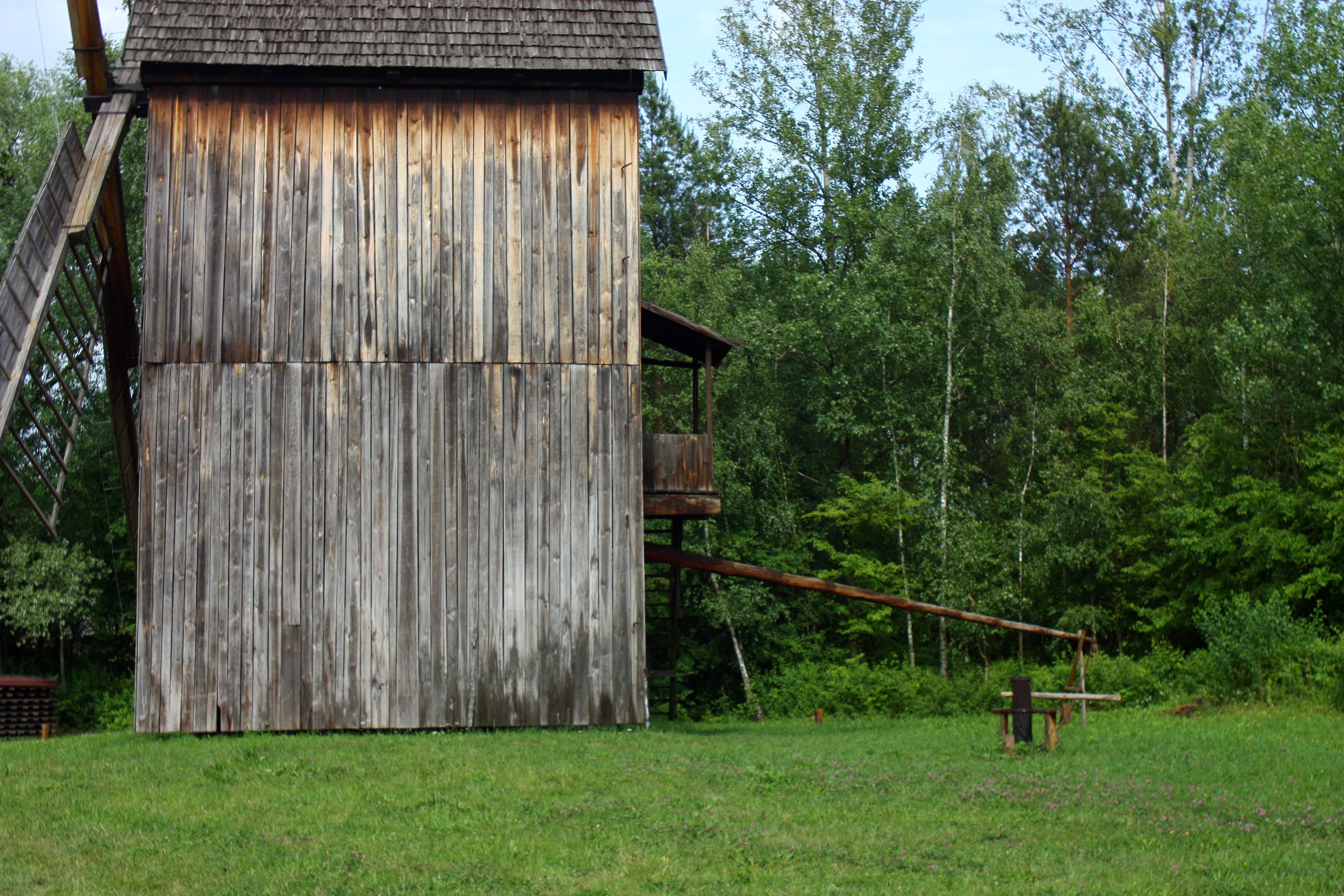 Wiatrak typu koźlak ze wsi Grotowice z połowy XIX wieku. Na zdjęciu widoczny mechanizm obracania wiatraka w kierunku wiatru. Wiatrak dwukondygnacyjny o konstrukcji słupowej, ryglowej, szalowany deskami.