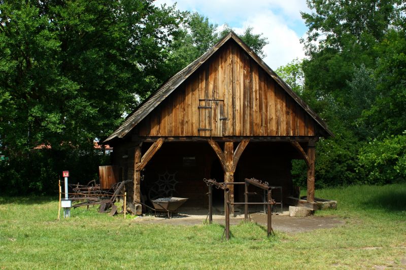 Kuźnia ze wsi Ziemiełowice z 1726 roku. Budynek o konstrukcji zrębowej z mocno wysuniętym do przodu dachem tworzącym podcień wsparty na trzech słupach wzmocnionych mieczowaniem. Dach dwuspadowy kryty gontem. Szczyt szalowany pionowymi deskami.