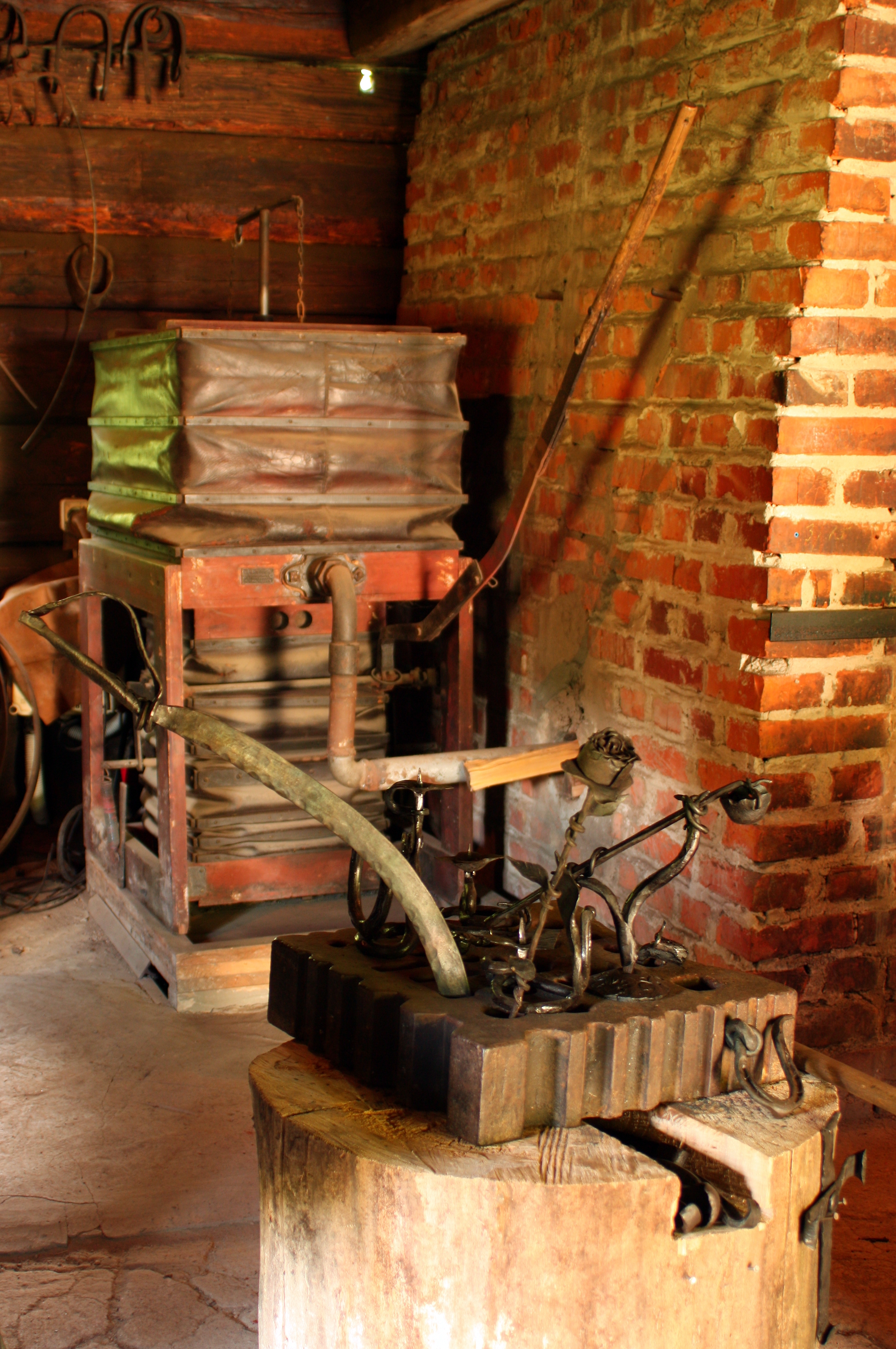 Wyroby kowalstwa artystycznego w kuźni ze wsi Ziemiełowice, w tle miech kowalski.