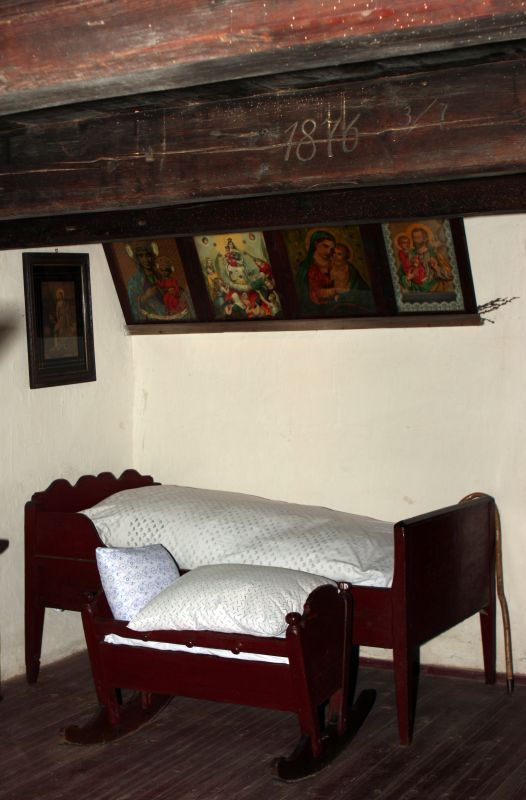 Wnętrze chałupy ze wsi Karmonki Nowe z 1876 roku. O dacie powstania chałupy informuje data wyryta na belce stropowej. Na ścianach wiszą oleodruki o treści religijnej.