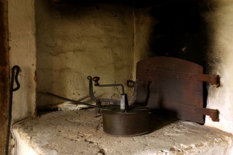 Zaparzacz do kawy zbożowej stojący na piecu kuchennym w czarnej izbie chałupy ze wsi Dąbrówka Dolna.