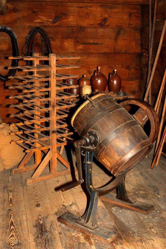 Butermaszina czyli maślnica klepkowa służąca do wyrobu masła, z tyłu stojak na ostygające kołacze (tradycyjne śląskie ciasto) w czarnej izbie chałupy ze wsi Dąbrówka Dolna.