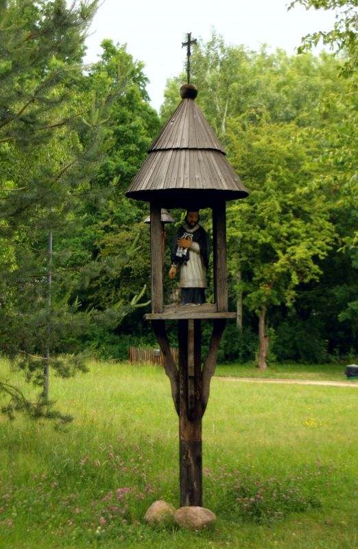 Słupowa kapliczka z figurką św. Jana Nepomucena ze wsi Popielów z przełomu XVIII/XIX wieku. Stożkowy dach kryty gontem z krzyżem na szczycie.