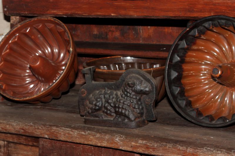 Formy do pieczenia babek. Po środku forma do wypieku baranka wielkanocnego.