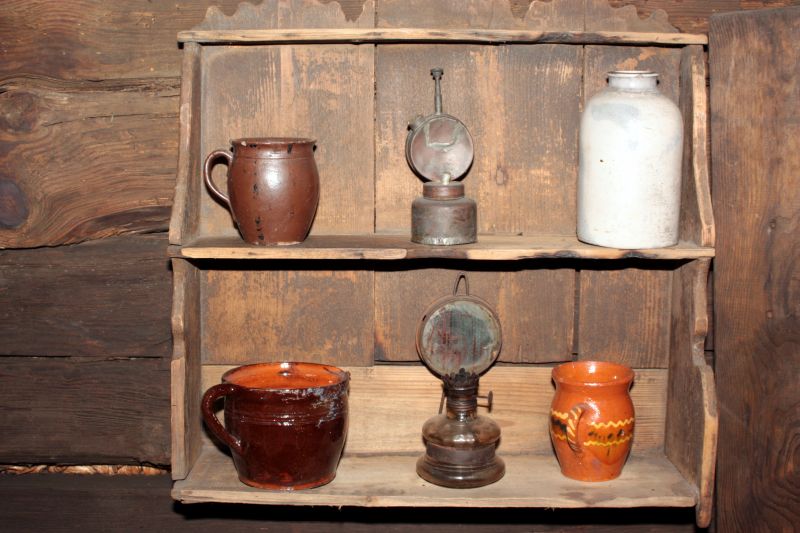 Wyposażenie izby dziadków – lampy nafrowe i gliniane naczynia.