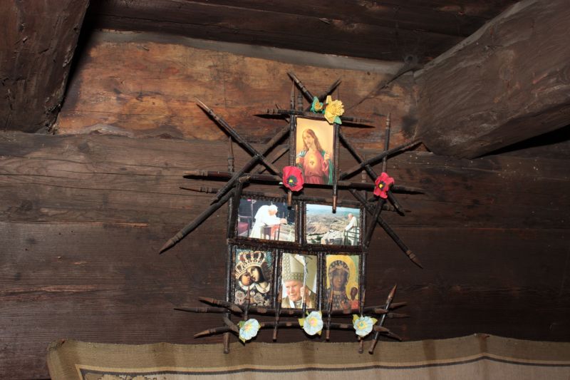 Współczesna kapliczka zdobiąca stare wnętrze jednej z muzealnych izb.