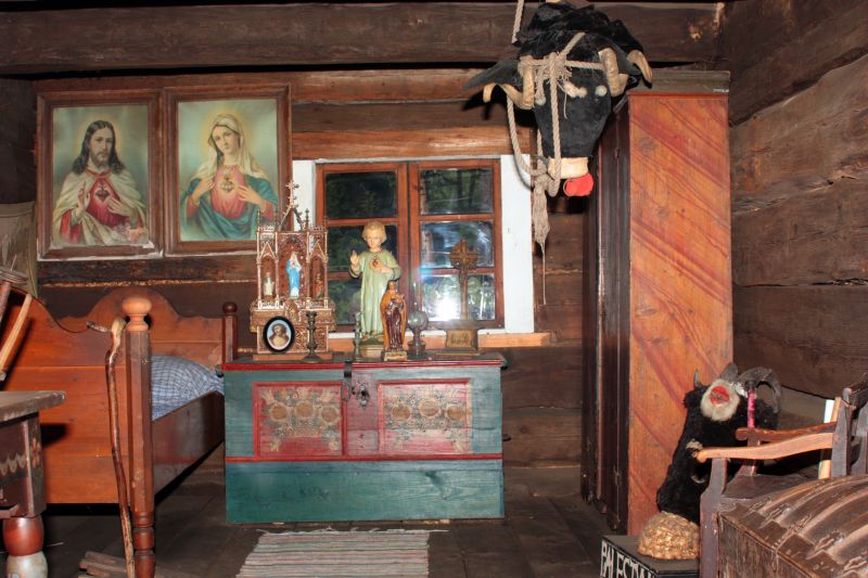 Wystrój izby starszych gospodarzy w chałupie ze wsi Grzawa: polichromowana skrzynia, drewniany ołtarzyk, oleodruki o treści religijnej na ścianach.