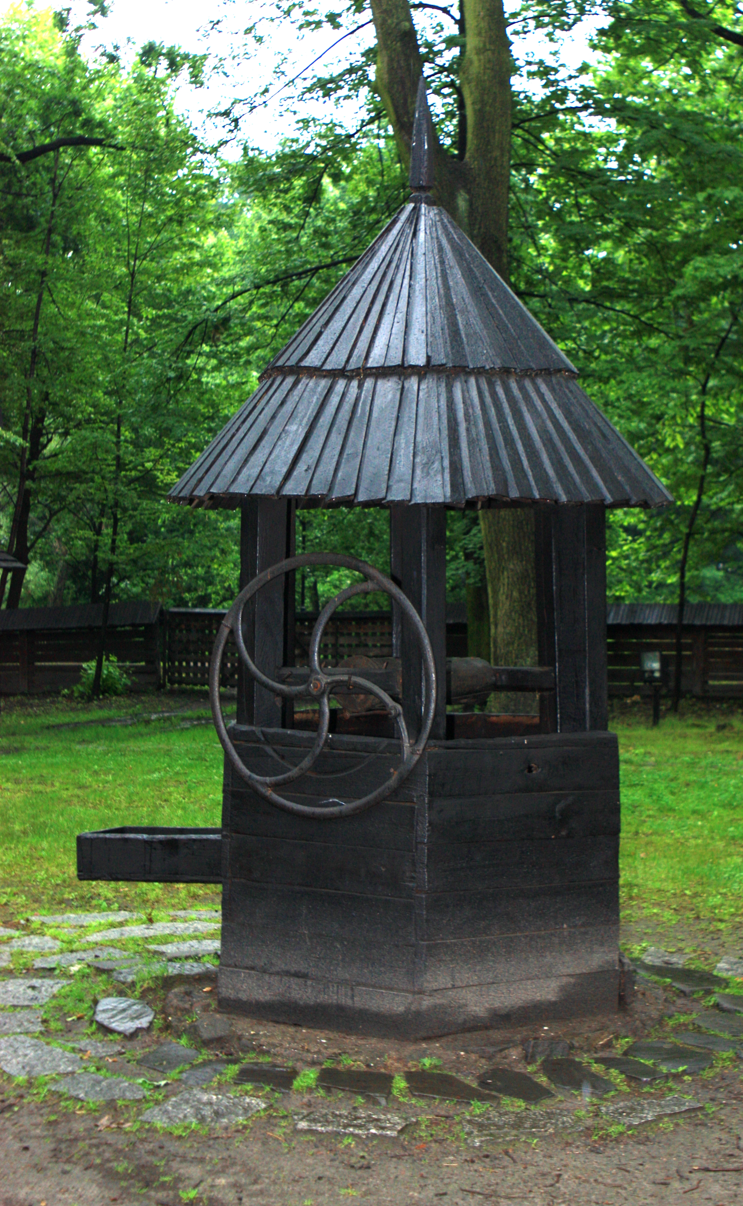 Studnia ze wsi Łąka. Rekonstrukcja sześciobocznej, popularnej w regionie pszczyńskim, drewnianej studni. Studnia o konstrukcji zrębowej. Dach w kształcie stożka kryty gontem. Pobór wody karbowym kołem zamachowym.