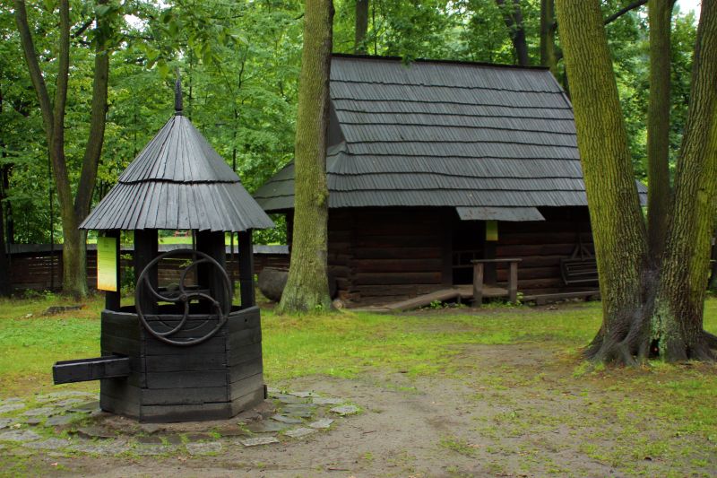 Pejzaż Muzeum: położona wśród zieleni i lasu studnia ze wsi Łąka i w głębi – spichlerz ze wsi Rudołtowice.