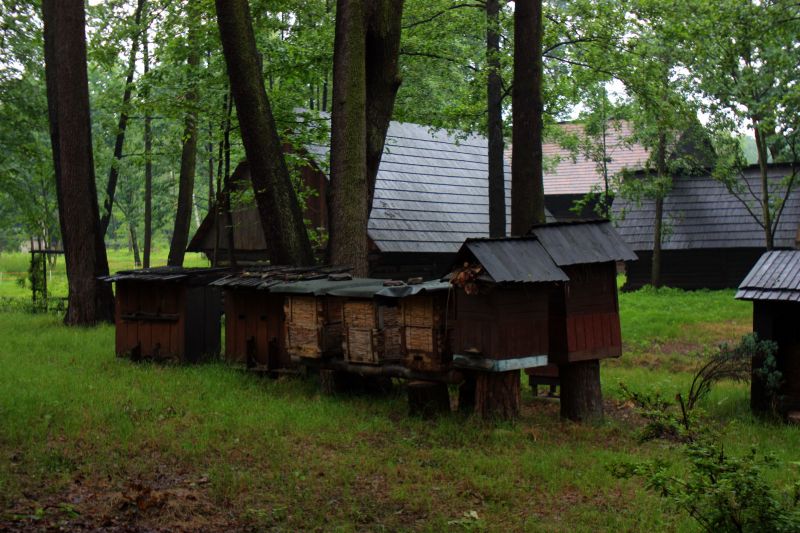 Pasieka. Zgromadzono w niej wszystkie typy uli spotkanych nie tylko na ziemi pszczyńskiej, ale także na całym Śląsku. Na zdjęciu ule skrzynkowe, małe przenośne oraz plecione ze słomy i oblepione gliną (tzw. "koszki").