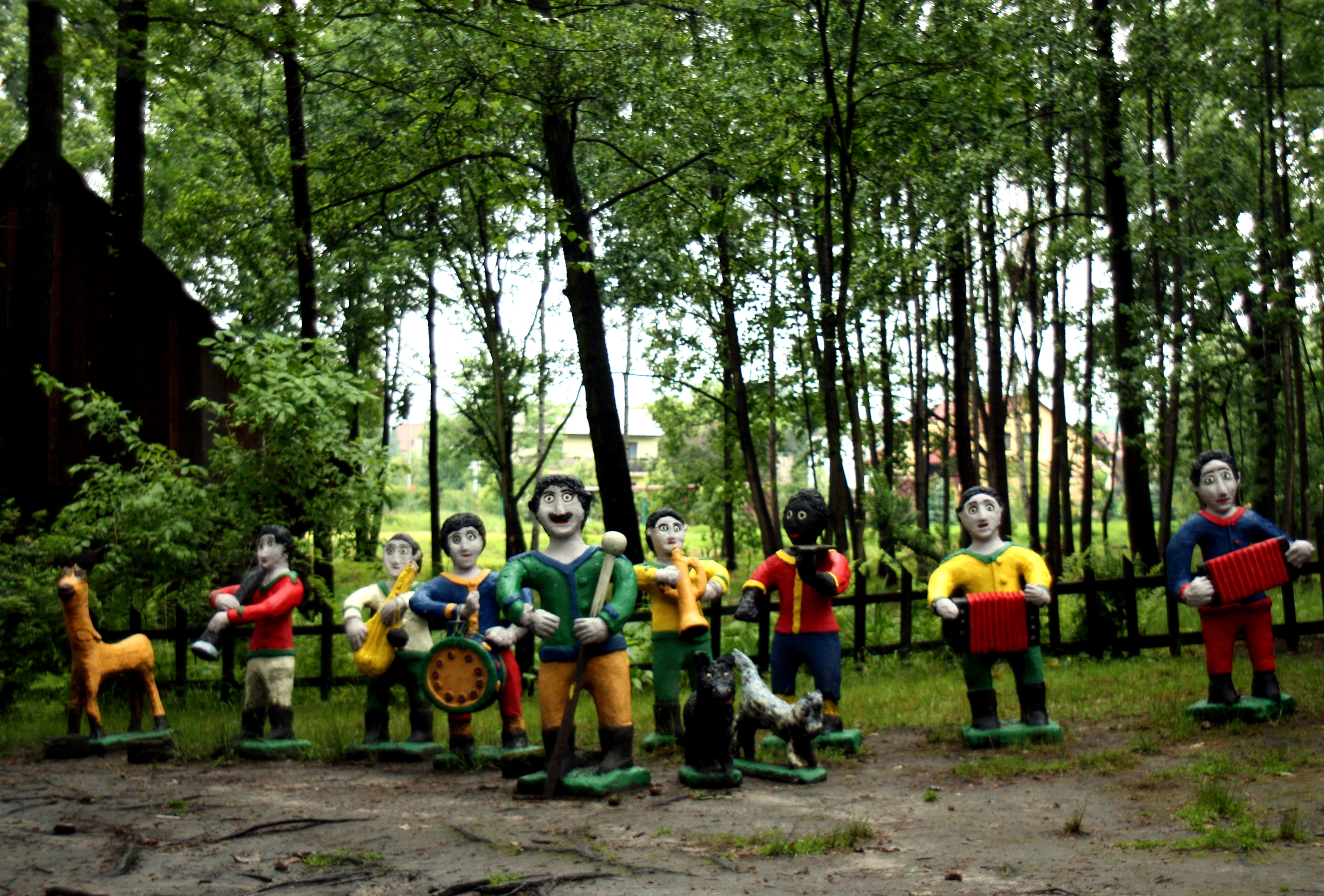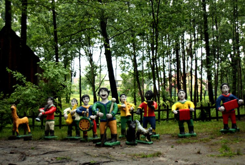 Polichromowane rzeźby ludowe ożywiające swoimi barwami teren parkowy.