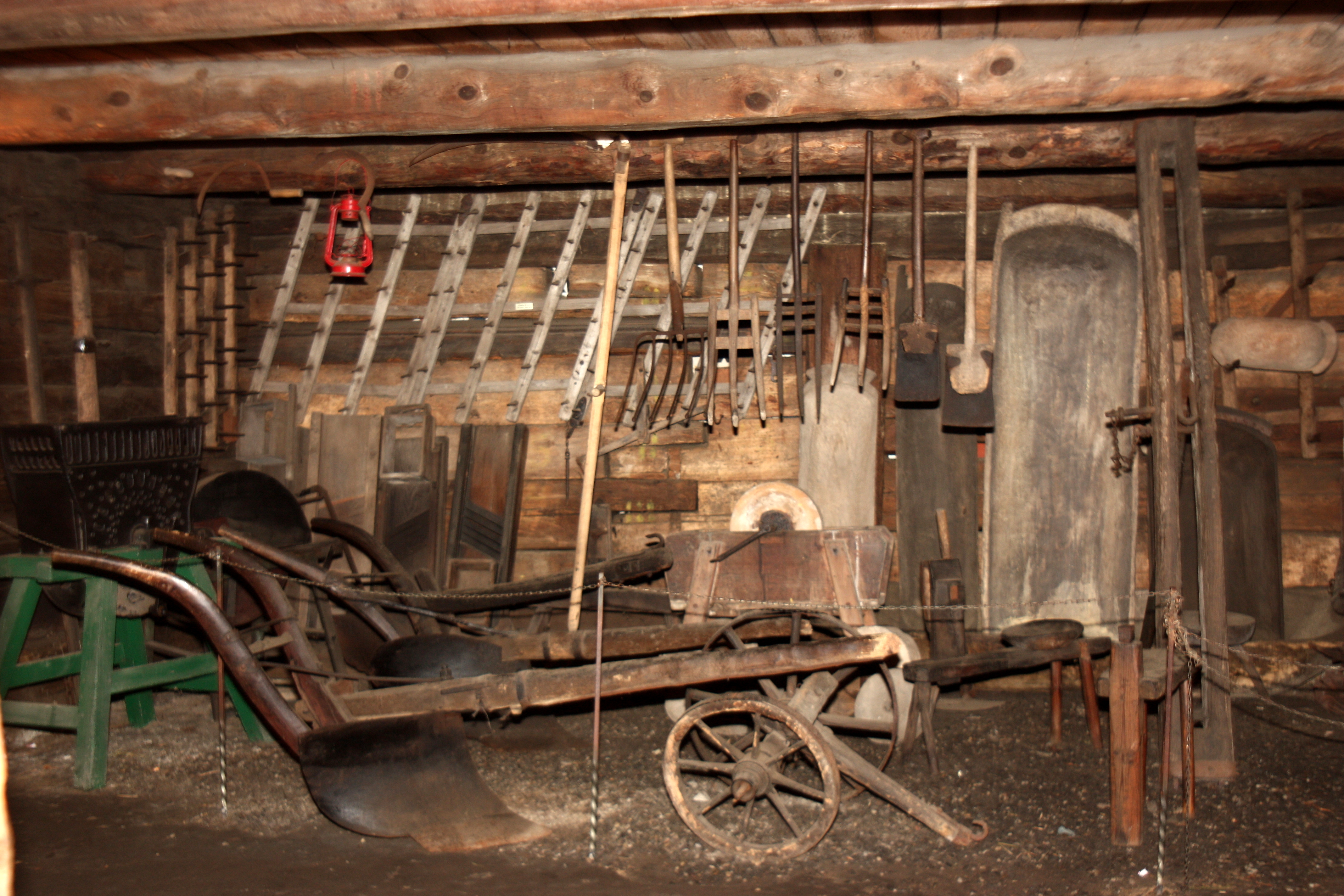 Wnętrze masztalni, a w nim: pługi, brony, drewniane widły i łopaty, chomąta dla koni i krów, babki do ostrzenia kos, koziołki rymarskie oraz kobylice do obróbki elementów drewnianych.
