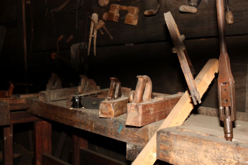Drewniane cyrkle, heble i ściski (imadła) stolarskie, a także inne przyrządy niezbędne przy naprawach wiejskich pojazdów i maszyn w warsztacie stolarskim.