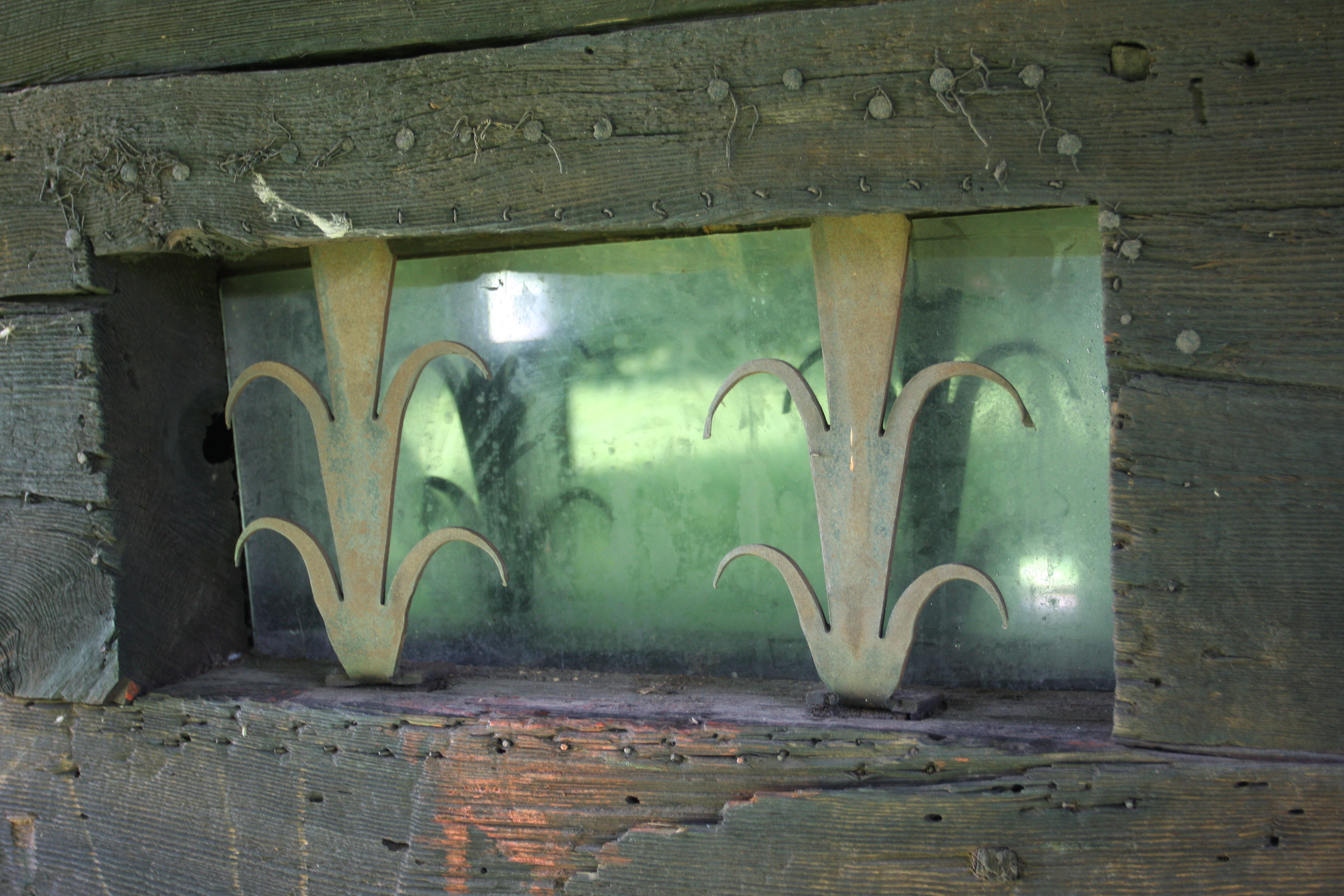 Jedno z ośmiu okienek – wyglądów z kutymi zadziorami kowalskimi spichlerza folwarcznego ze wsi Kuźnica Grabowska.