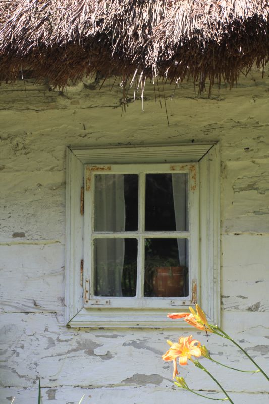 Okno w chałupie wyrobnika z podkaliskiej wsi Dobrzec z początku XIX wieku.