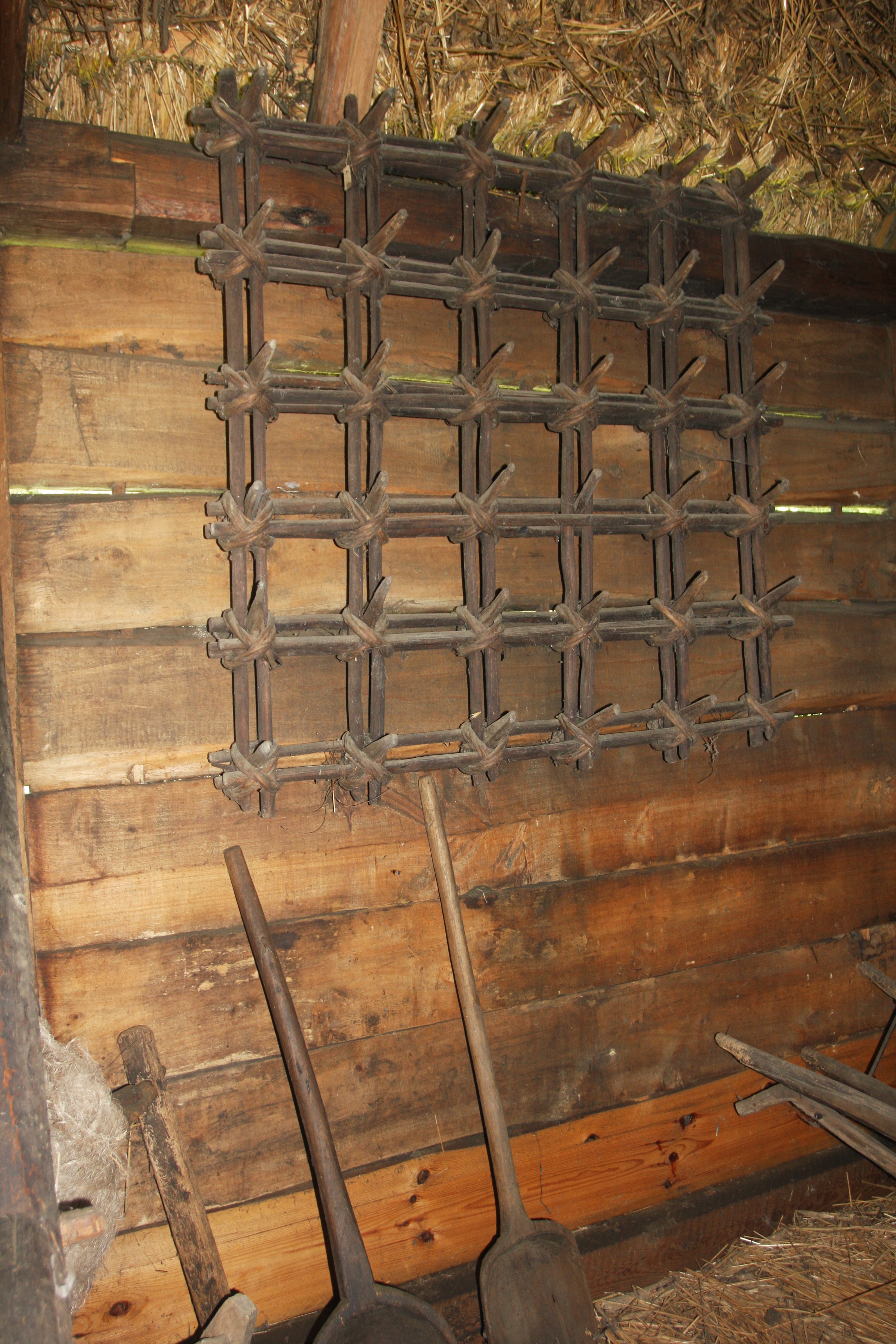 Brona laskowa. Na dole przy ścianie stoją drewniane łopaty.