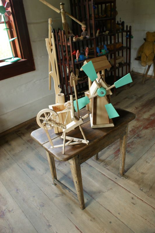 Wystawa „Dziecięce troski i beztroski”. Zabawki z drewna: model kołowrotka, wiatraka oraz studni.